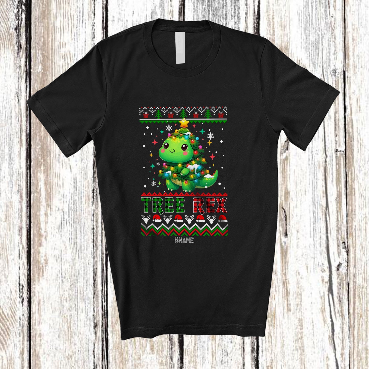 Personalized Custom Name Tree Rex; Lovely Christmas Lights Tree Sweater Plaid T-Rex Dinosaur T-Shirt
