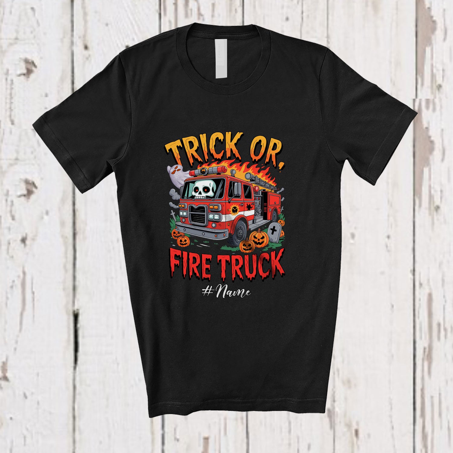 Personalized Custom Name Trick Or Fire Truck; Horror Halloween Costume Firetruck Firefighter Skull T-Shirt