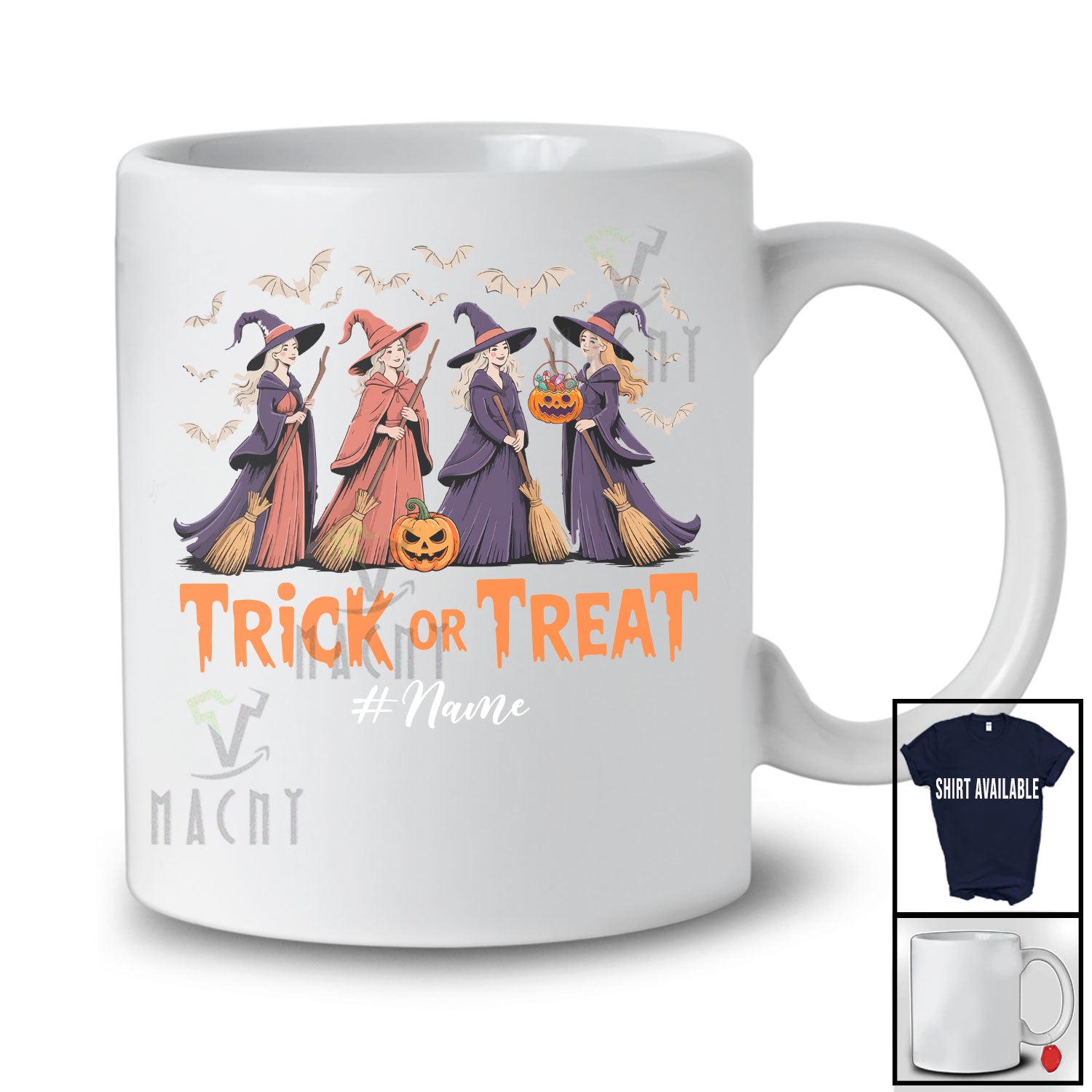 Personalized Custom Name Trick Or Treat; Horror Halloween Four Witch Squad; Family Group T-Shirt. This cotton t-shirt is a durable staple product with a classic fit. One of the most popular items, it has a relaxed style made for everyday and casual wear.