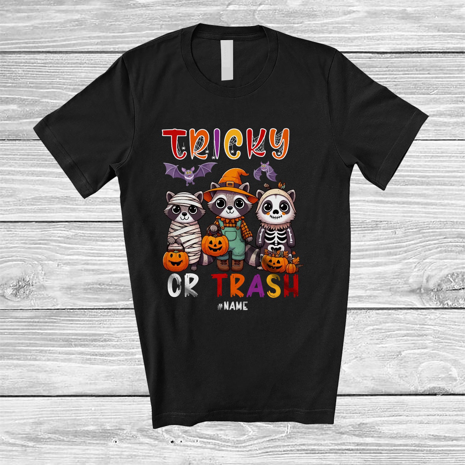 This Personalized Custom Name Tricky And Trash; Lovely Halloween Three Raccoon Mummy Witch T-Shirt is great idea gift for your family, friends in this birthday, christmas, mother's day, father's day, patrick's day or any holiday.