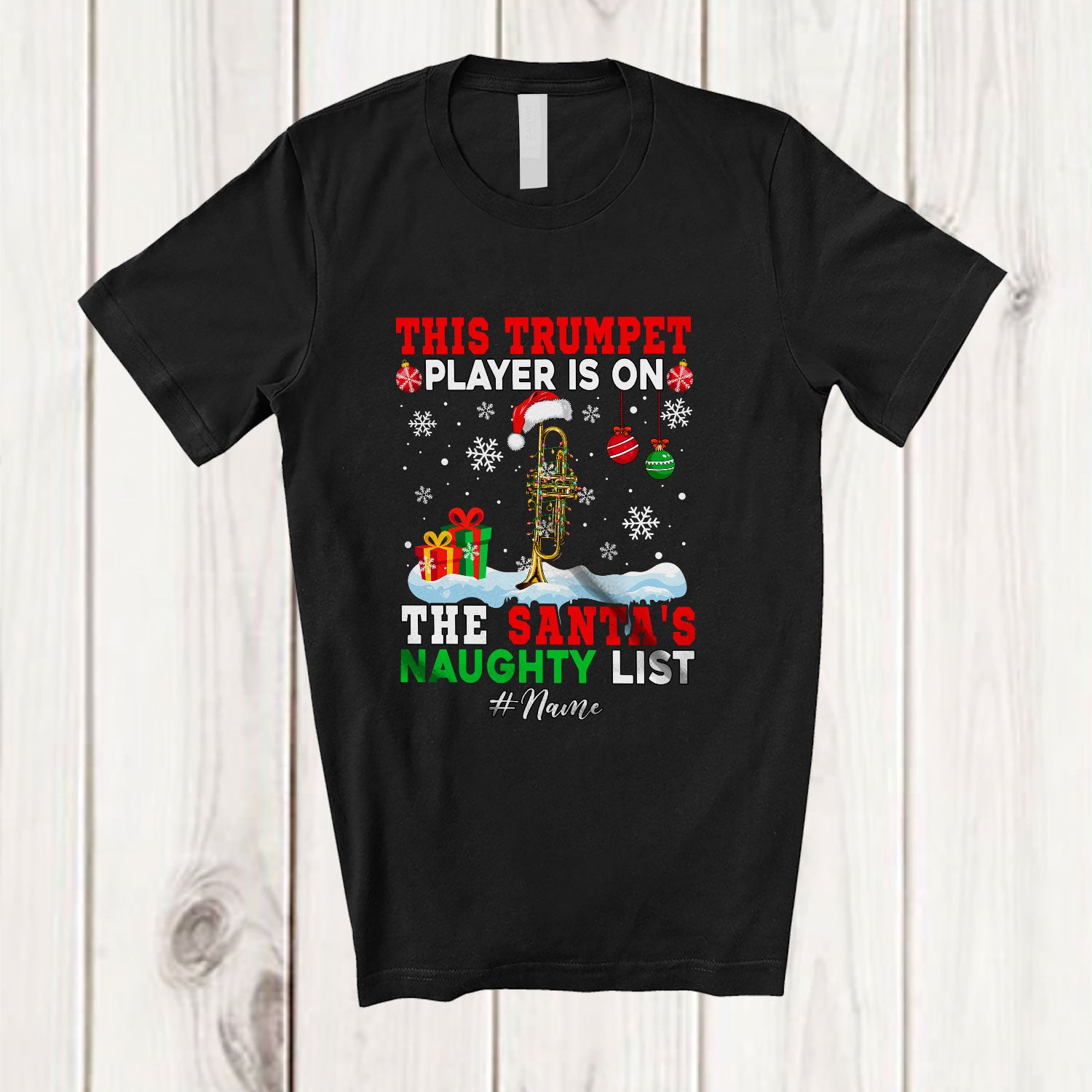 The Personalized Custom Name Trumpet Player Team On Naughty List; Joyful Christmas Musician Snowman T-Shirt destined to impress, and priced at only $12.95, for a limited time.