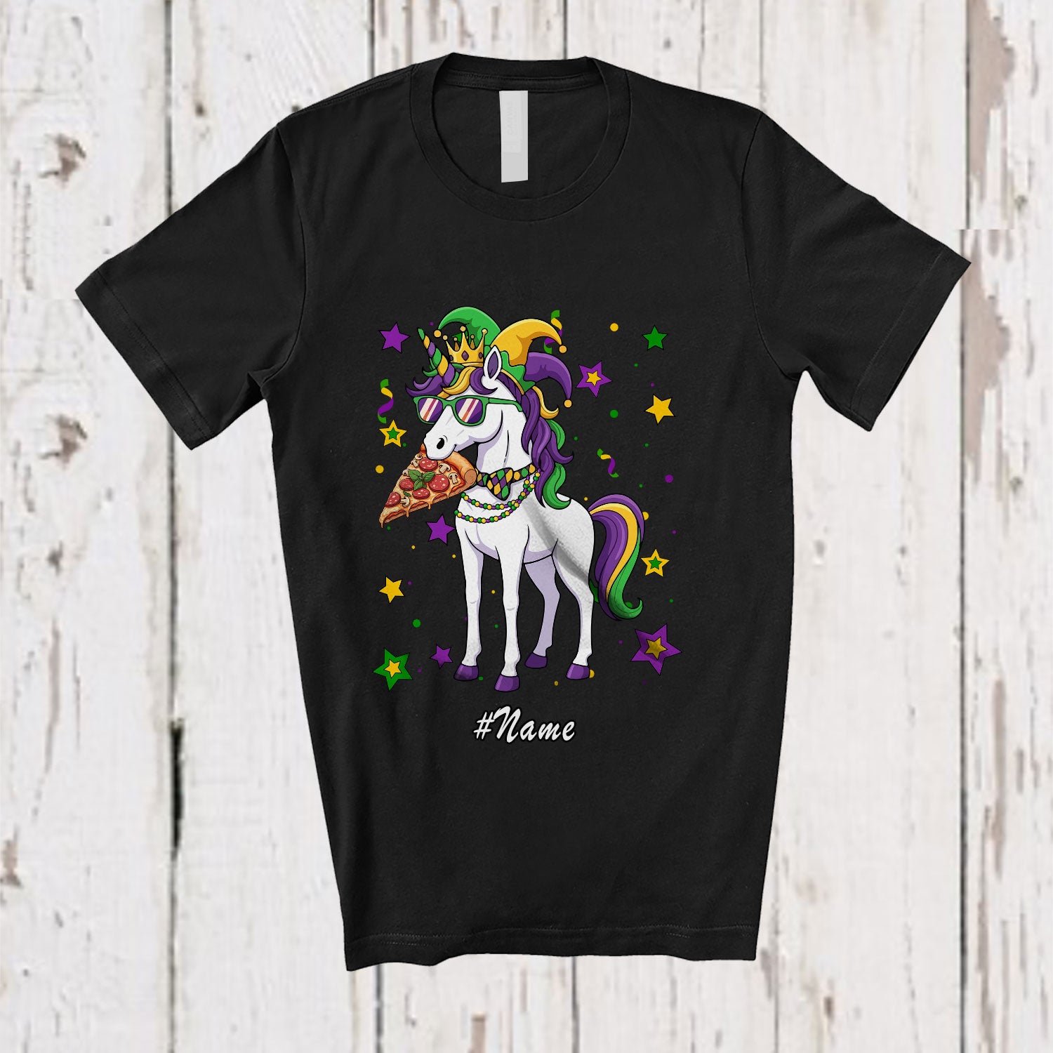 Personalized Custom Name Unicorn Sunglasses Eating Pizza; Joyful Mardi Gras Beads Italian Food T-Shirt. This cotton t-shirt is a durable staple product with a classic fit. One of the most popular items, it has a relaxed style made for everyday and casual wear.