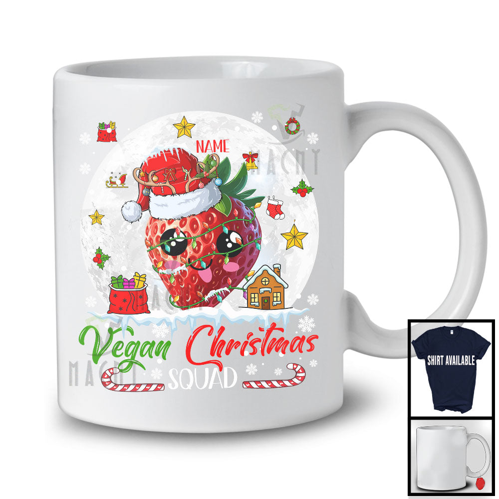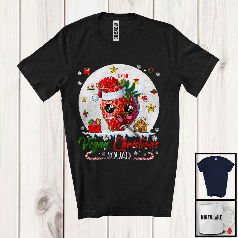 • Personalized Custom Name Vegan Christmas Squad, Joyful X-mas Santa Reindeer Strawberry, Fruit T-Shirt. This cotton t-shirt is a durable staple product with a classic fit. One of the most popular items, it has a relaxed style made for everyday and casual wear.