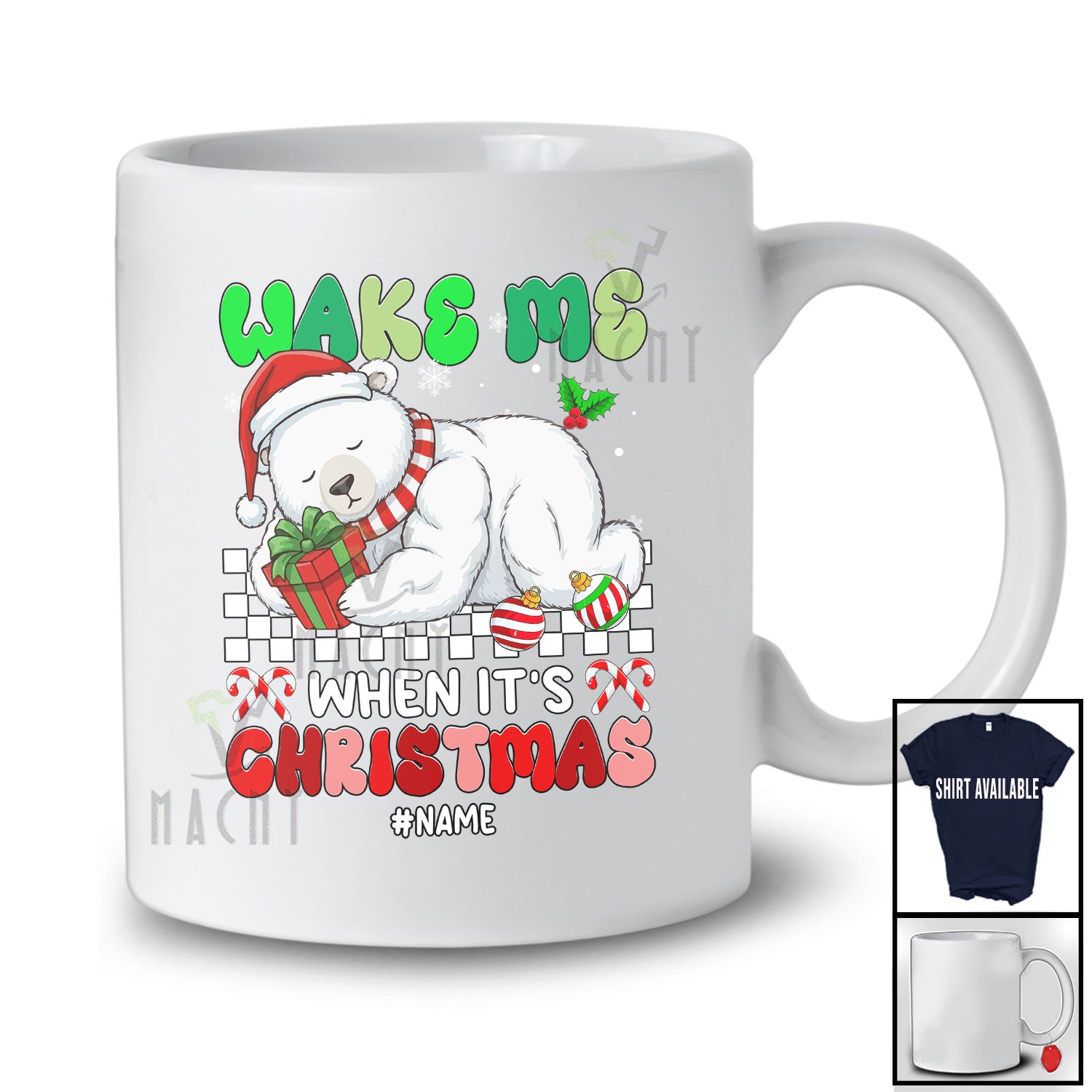 Personalized Custom Name Wake Me When It's Christmas; Lovely Santa Polar Bear Sleepy Animal T-Shirt. This cotton t-shirt is a durable staple product with a classic fit. One of the most popular items, it has a relaxed style made for everyday and casual wear.