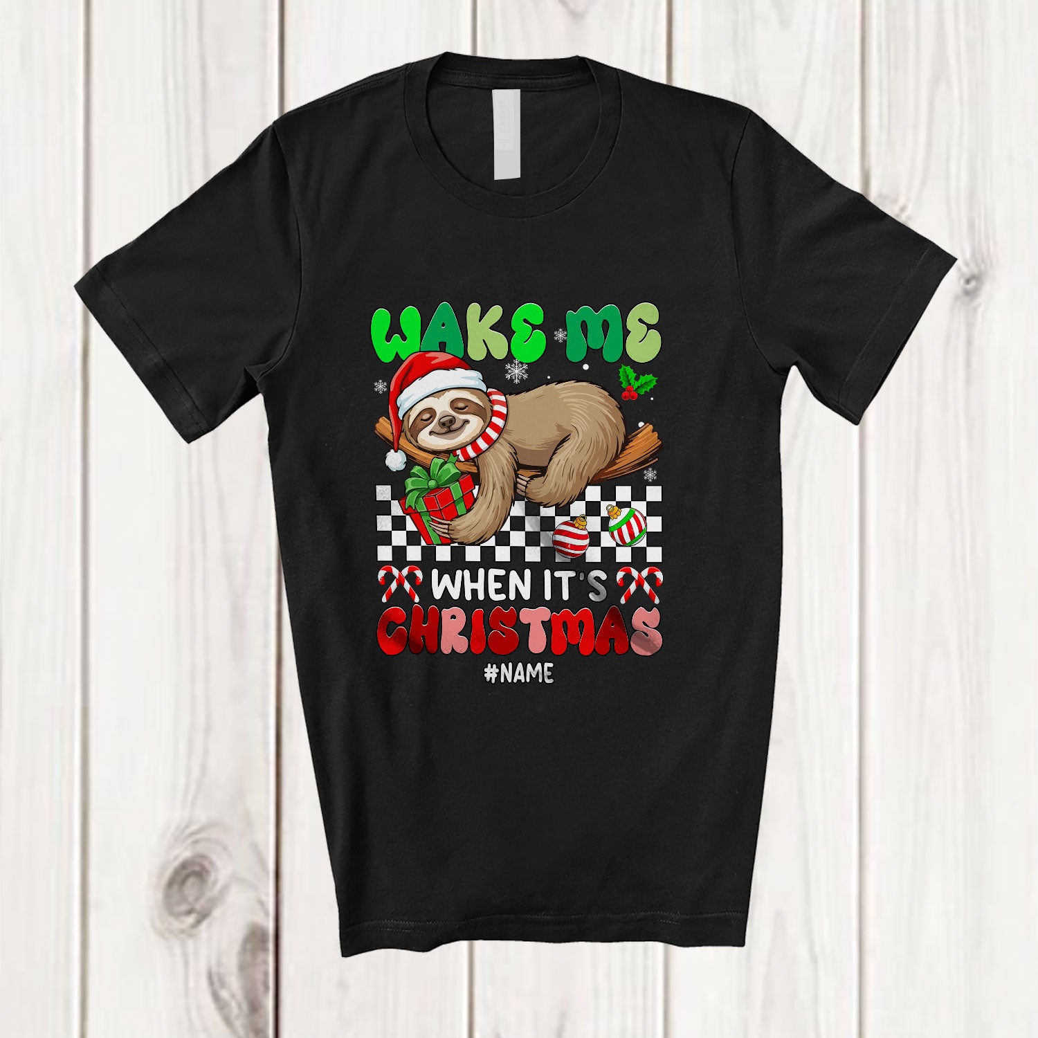 Personalized Custom Name Wake Me When It's Christmas; Lovely Santa Sloth Sleepy Animal T-Shirt
