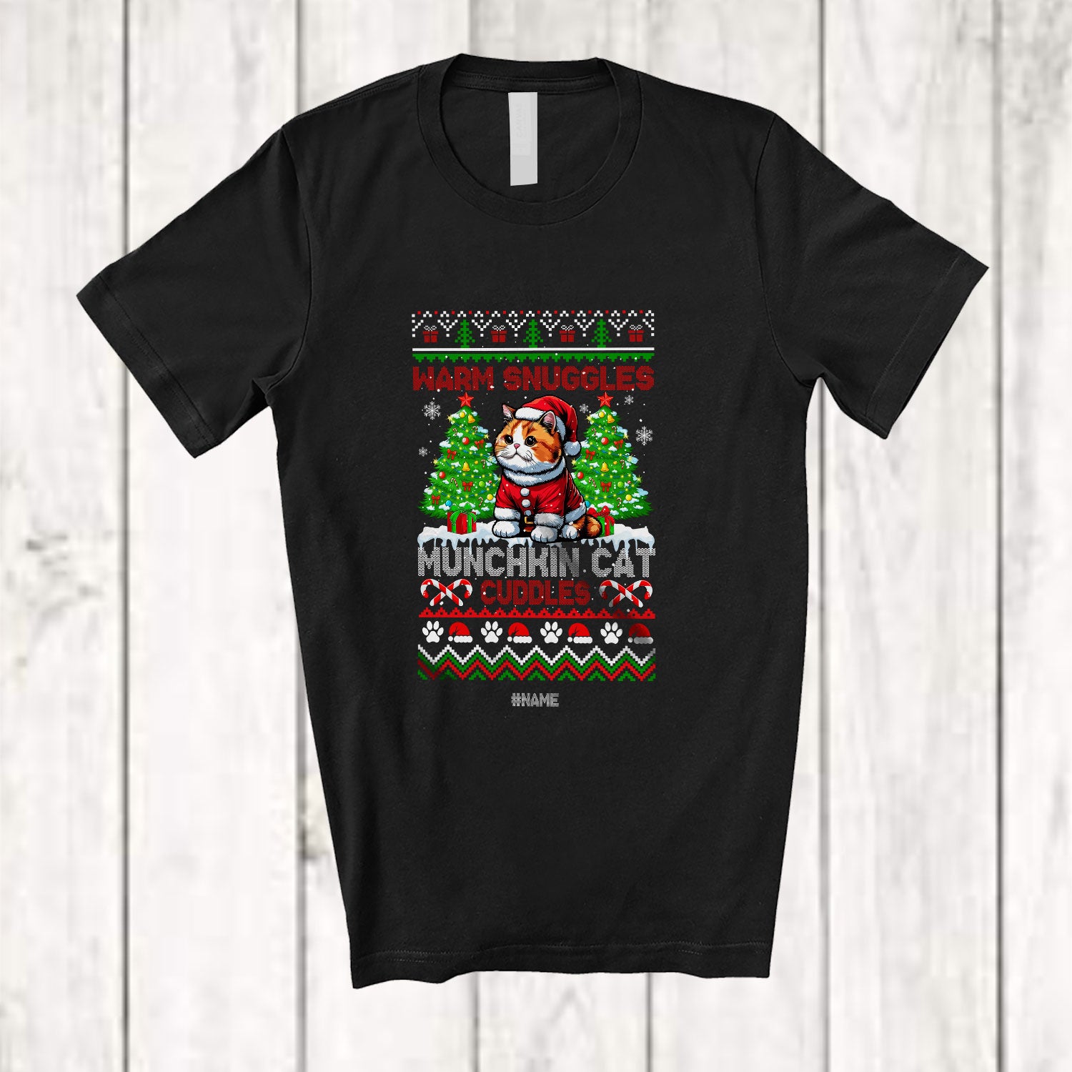 • Personalized Custom Name Warm Snuggles Munchkin Cat; Lovely Christmas Tree Sweater T-Shirt. This cotton t-shirt is a durable staple product with a classic fit. One of the most popular items, it has a relaxed style made for everyday and casual wear.