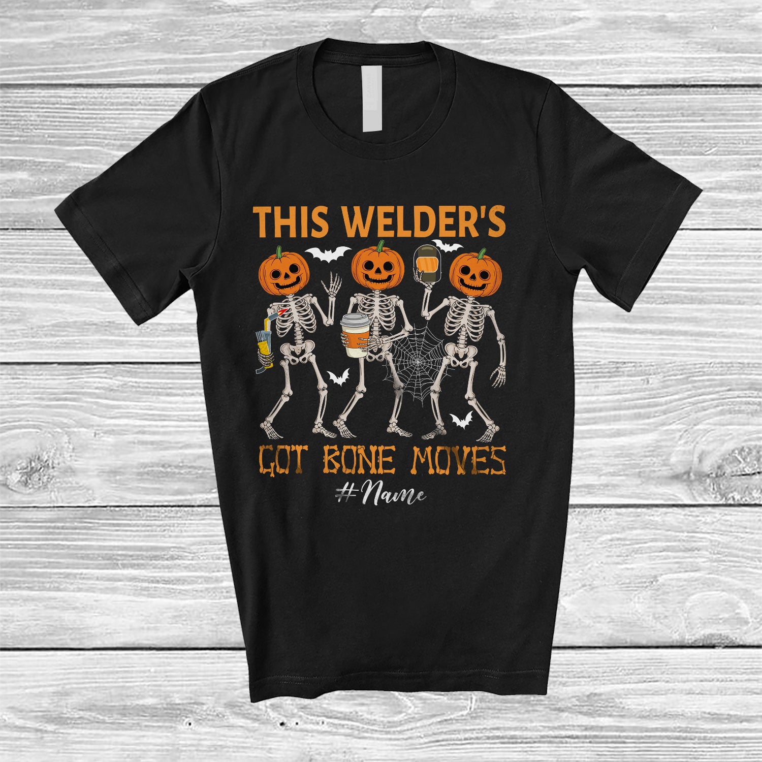 Personalized Custom Name Welder's Got Bone Moves; Joyful Halloween Pumpkin Skeletons T-Shirt. This cotton t-shirt is a durable staple product with a classic fit. One of the most popular items, it has a relaxed style made for everyday and casual wear.