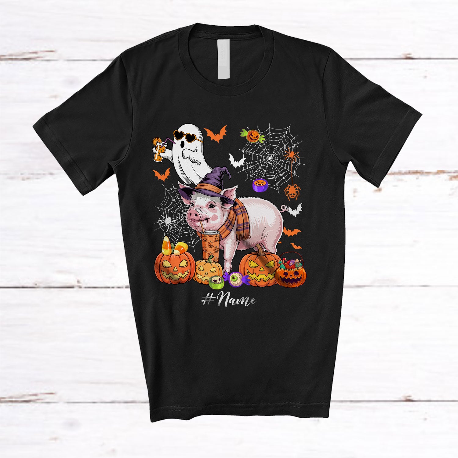 Personalized Custom Name Witch Pig Boo Drinking Coffee; Joyful Halloween Pig Farm Farmer T-Shirt. This cotton t-shirt is a durable staple product with a classic fit. One of the most popular items, it has a relaxed style made for everyday and casual wear.
