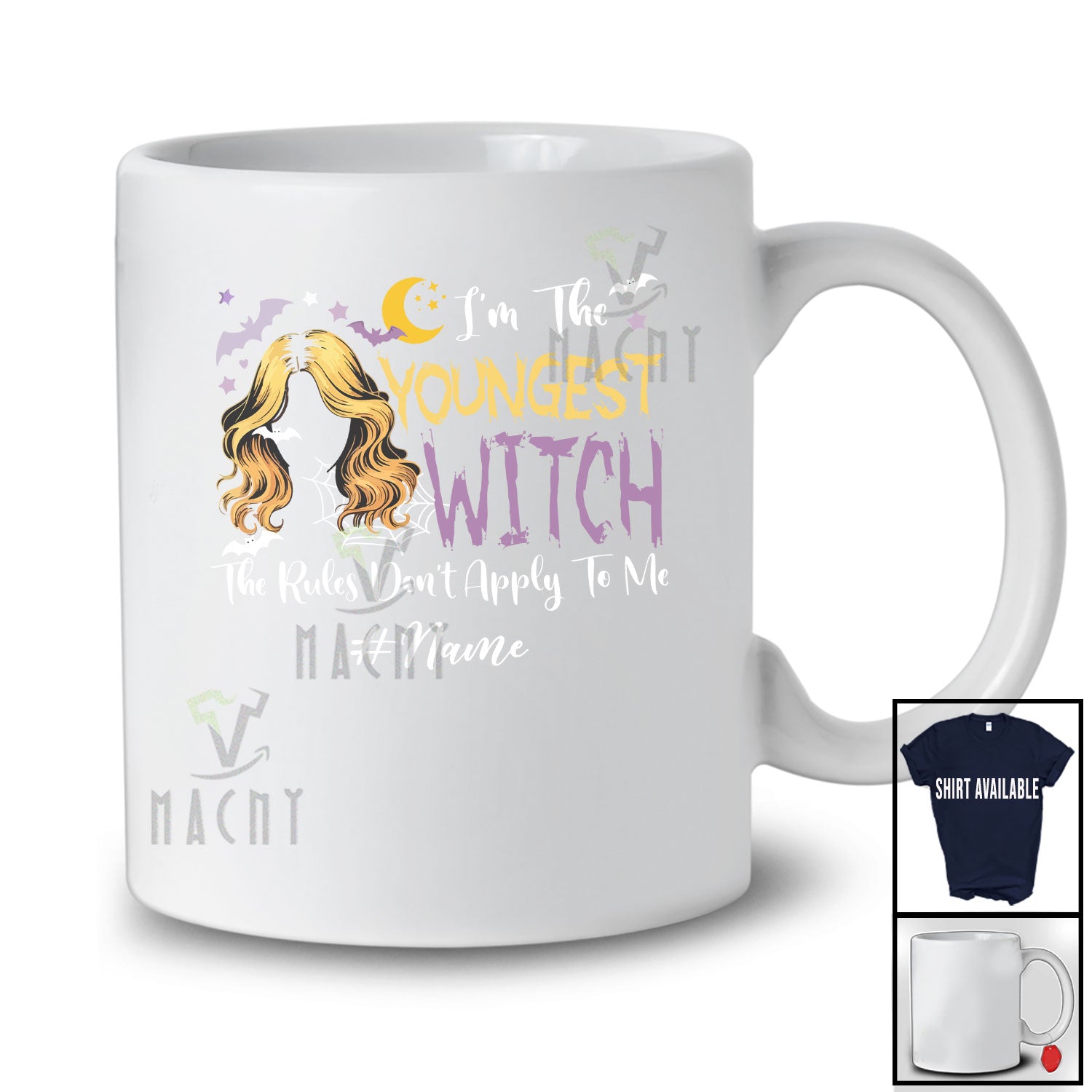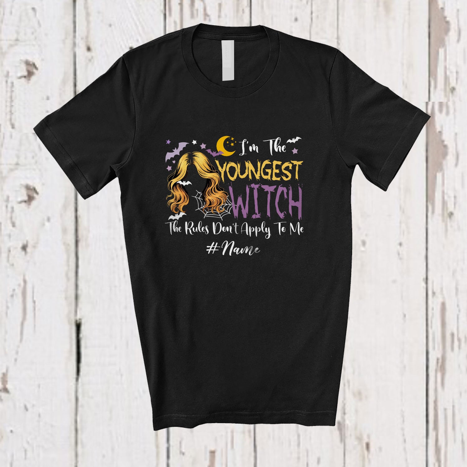 Personalized Custom Name Youngest Witch; Scary Halloween Witch Rules; Sister Family T-Shirt. This cotton t-shirt is a durable staple product with a classic fit. One of the most popular items, it has a relaxed style made for everyday and casual wear.