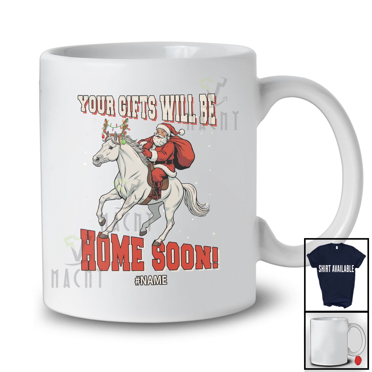Personalized Custom Name Your Gifts Will Be Home Soon; Joyful Christmas Santa Riding Horse T-Shirt. This cotton t-shirt is a durable staple product with a classic fit. One of the most popular items, it has a relaxed style made for everyday and casual wear.