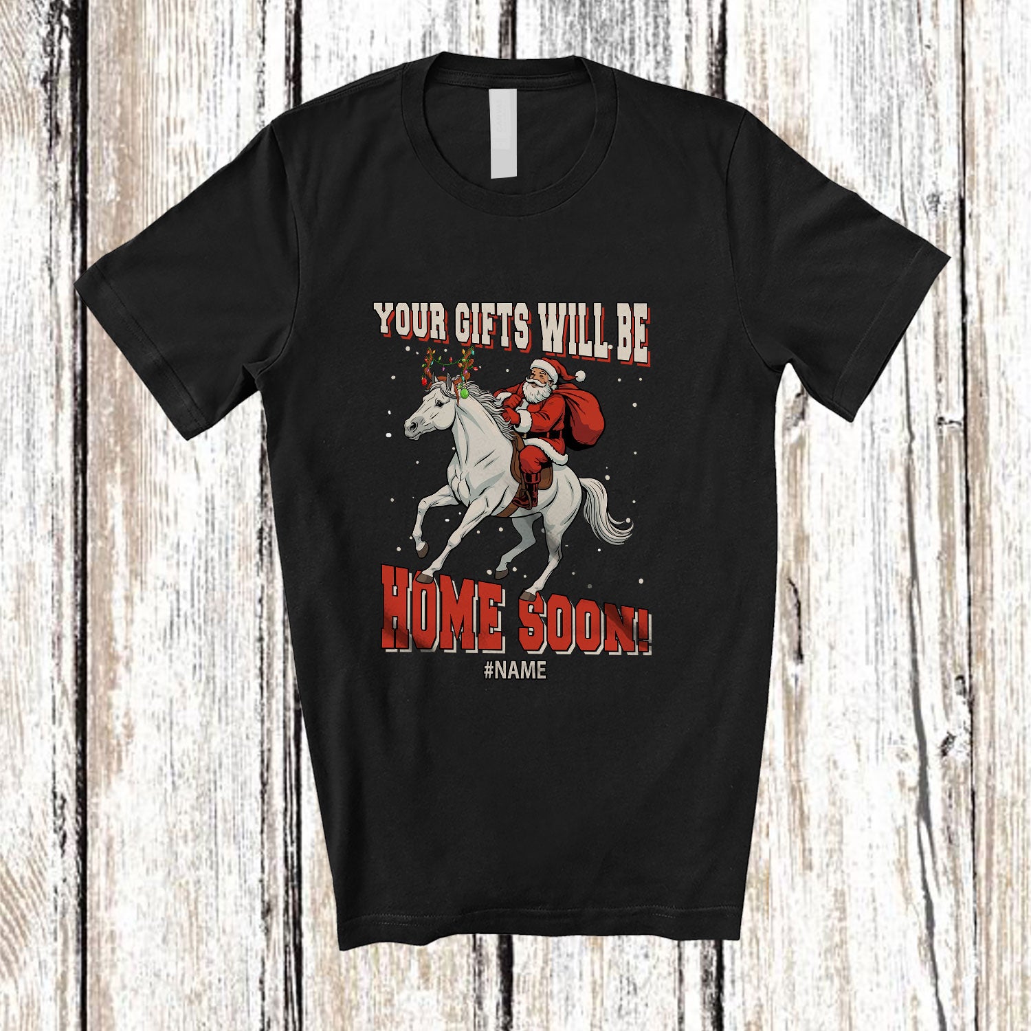 Personalized Custom Name Your Gifts Will Be Home Soon; Joyful Christmas Santa Riding Horse T-Shirt