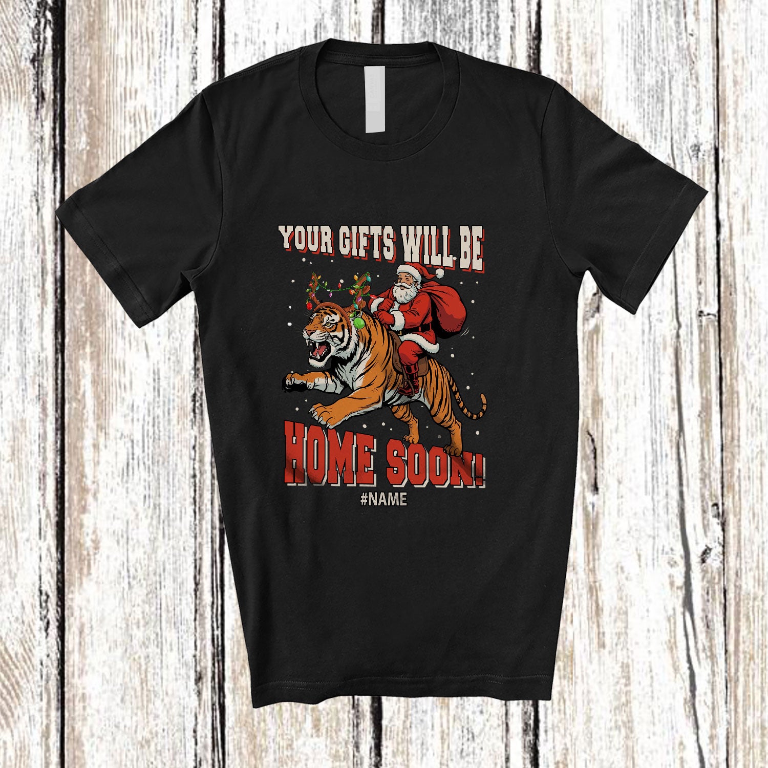 Personalized Custom Name Your Gifts Will Be Home Soon; Joyful Christmas Santa Riding Tiger T-Shirt