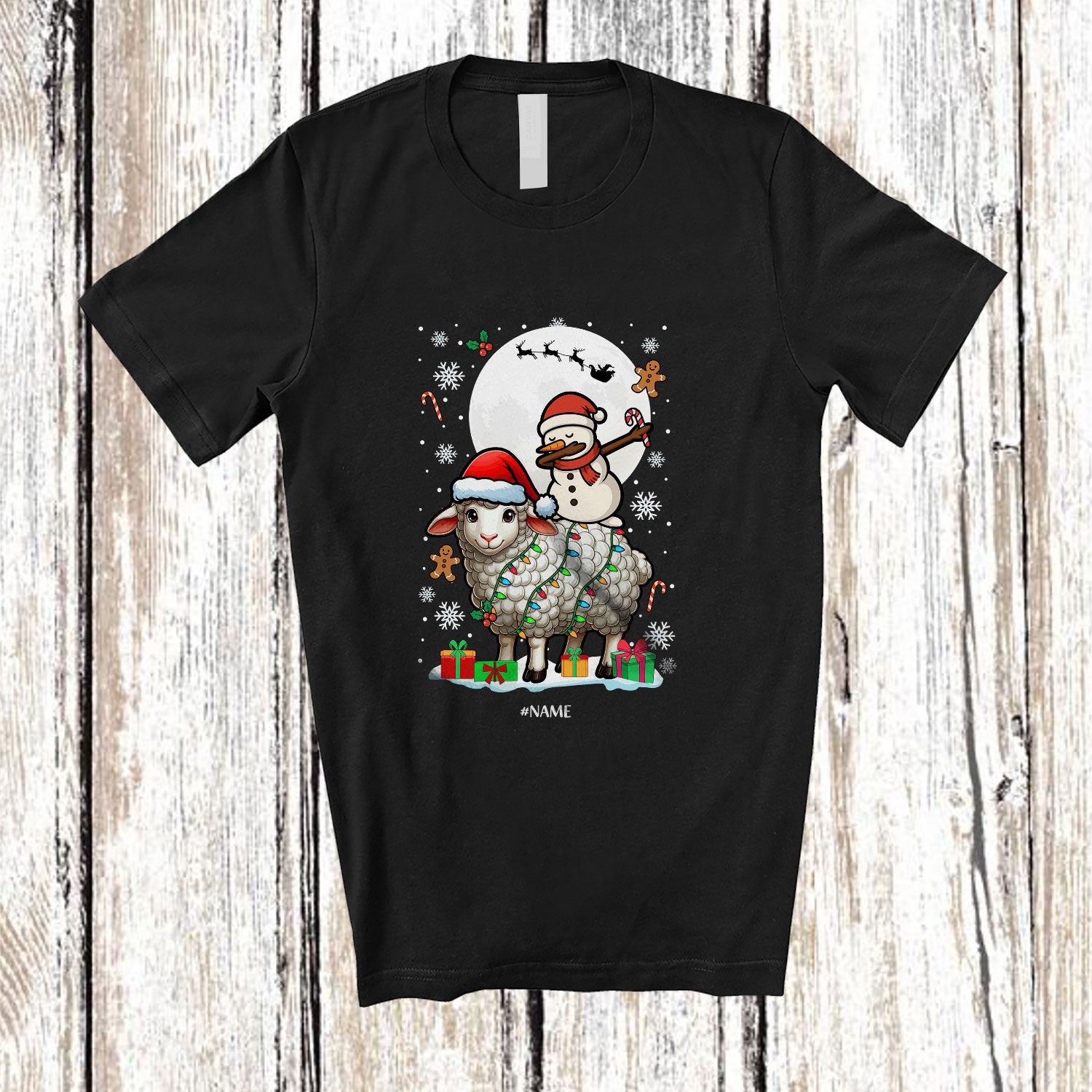 Personalized Dabbing Snowman Riding Sheep; Amusing Christmas Lights Custom Name Farmer T-Shirt