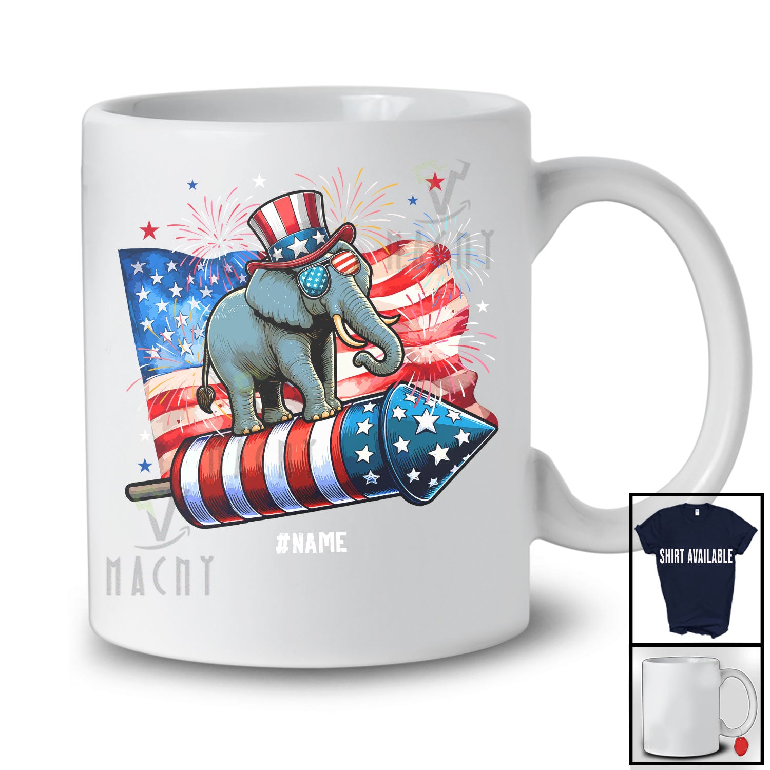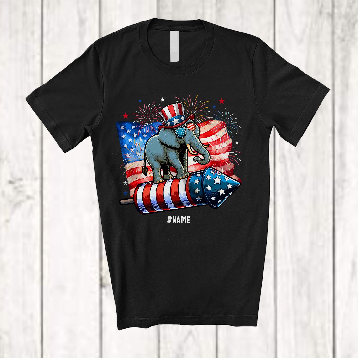 • Personalized Elephant Riding Firecracker American Flag; Amazing 4th Of July Custom Name Patriotic T-Shirt. This cotton t-shirt is a durable staple product with a classic fit. One of the most popular items, it has a relaxed style made for everyday and casual wear.