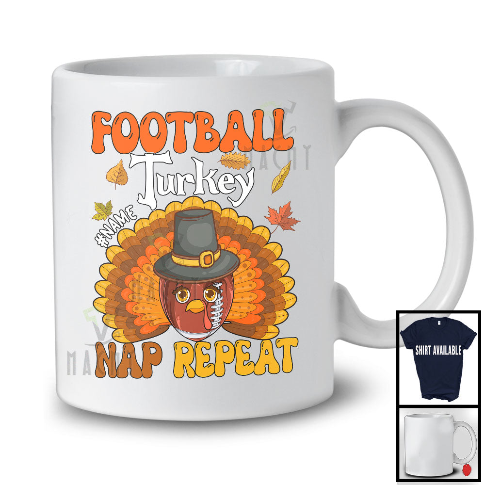 • Personalized Football Turkey Nap Repeat, Joyful Thanksgiving Fall Leaves, Custom Name Sport Player T-Shirt. This cotton t-shirt is a durable staple product with a classic fit. One of the most popular items, it has a relaxed style made for everyday and casual wear.