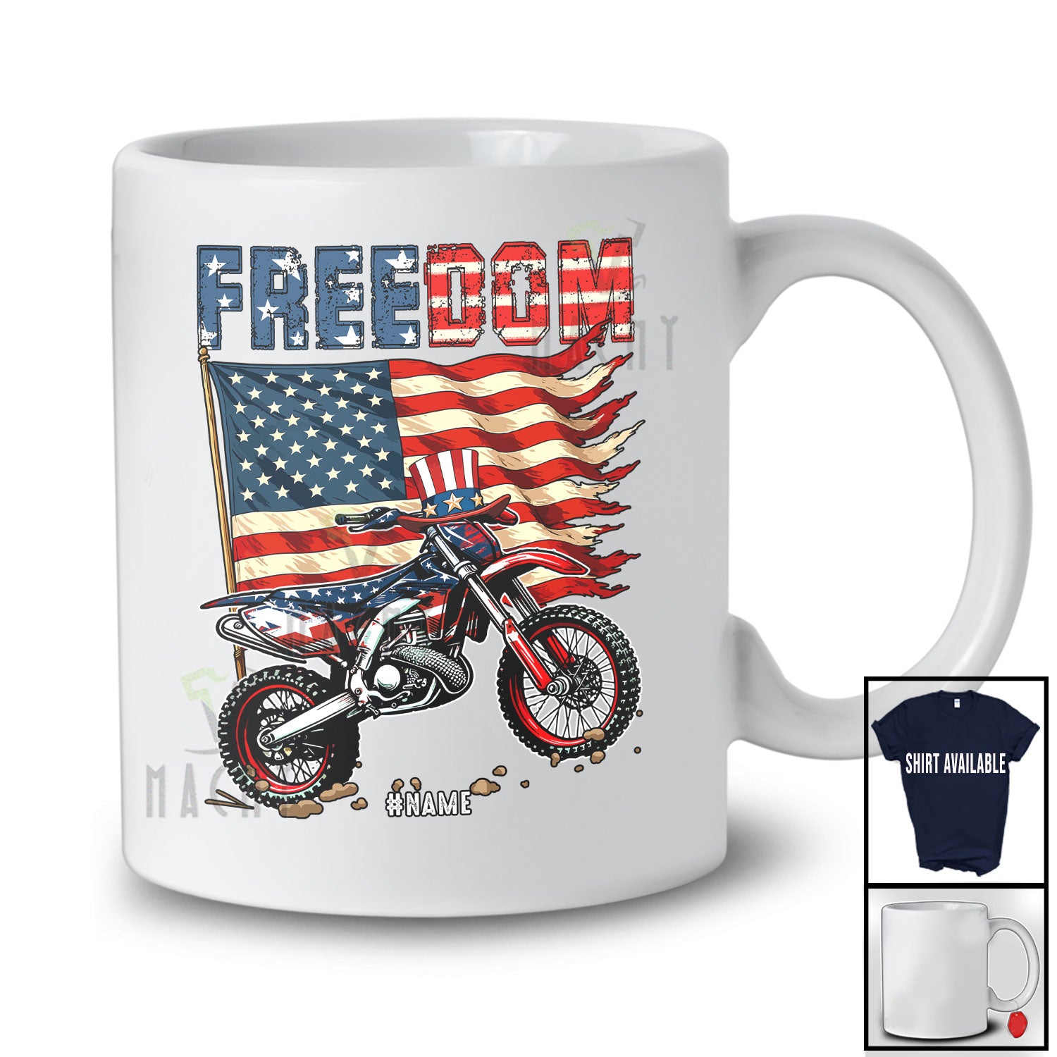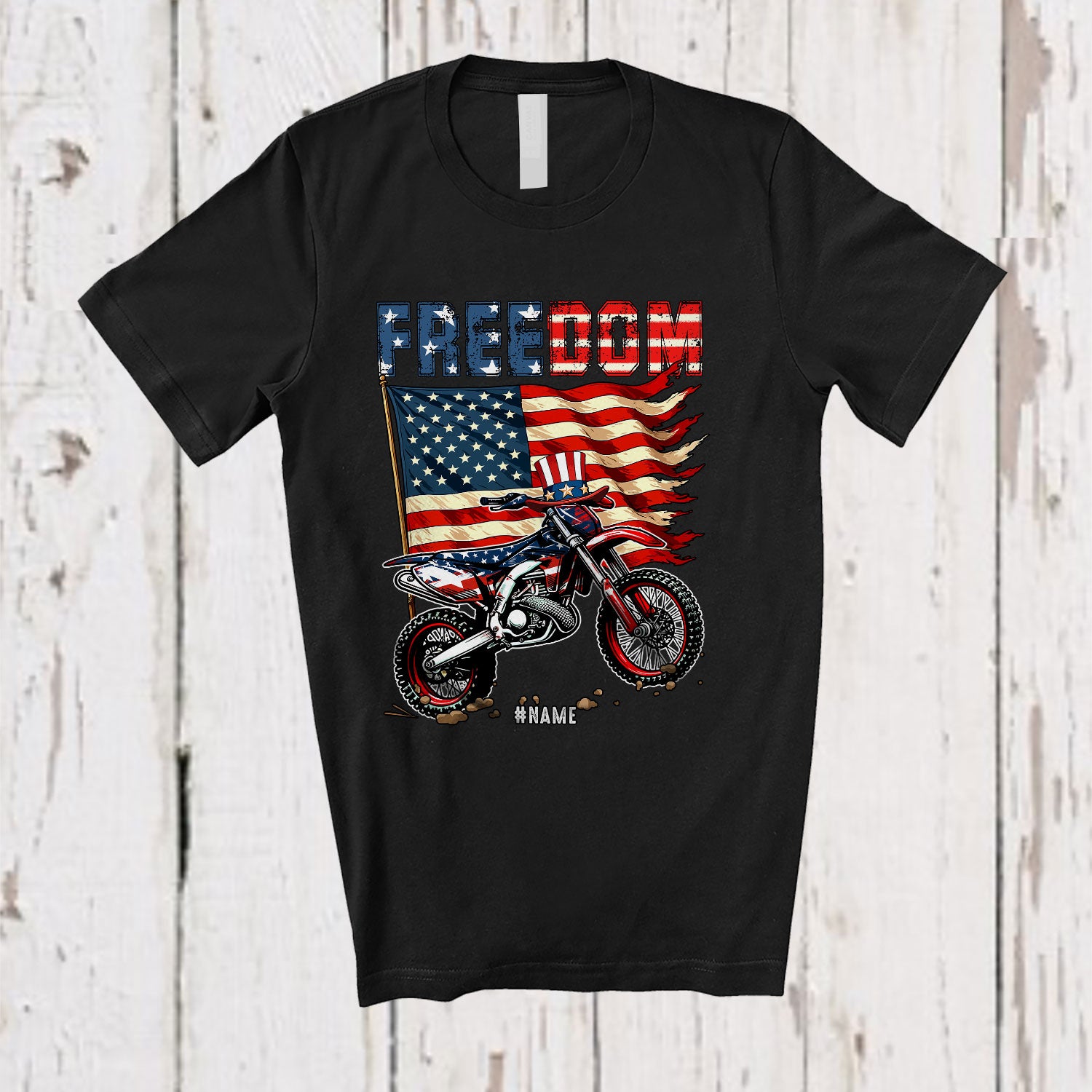 • Personalized Freedom; Awesome 4th Of July American Flag Custom Name Dirt Bike; Patriotic T-Shirt. This cotton t-shirt is a durable staple product with a classic fit. One of the most popular items, it has a relaxed style made for everyday and casual wear.