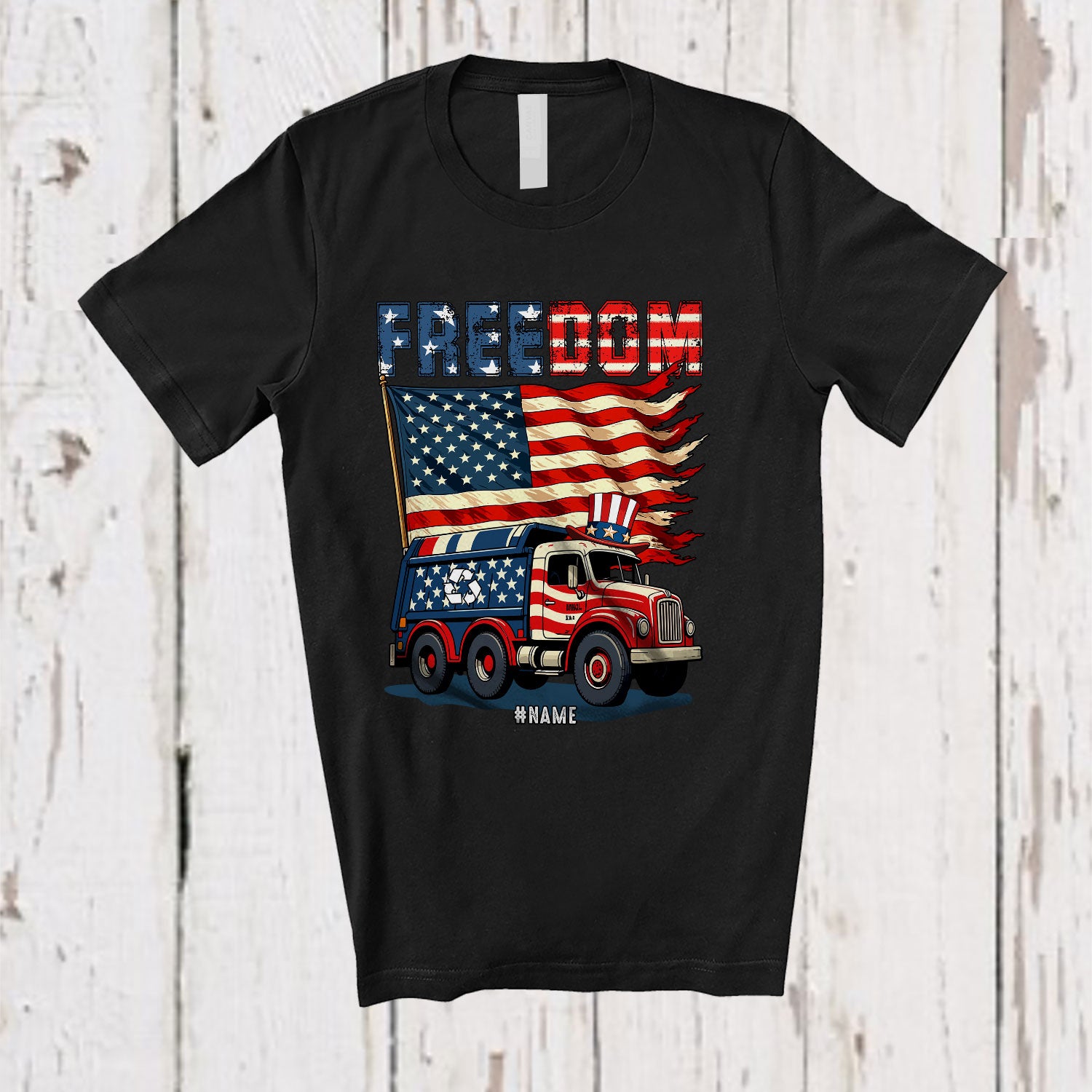 Personalized Freedom; Awesome 4th Of July American Flag Custom Name Garbage Truck; Patriotic T-Shirt