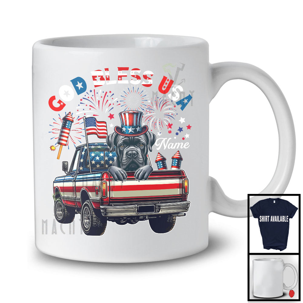 The Personalized God Bless USA, Lovely 4th Of July Custom Name Cane Corso On Pickup Truck, Patriotic T-Shirt destined to impress, and priced at only $12.95, for a limited time.