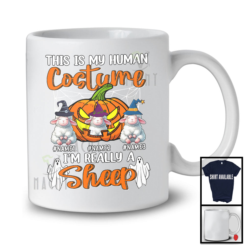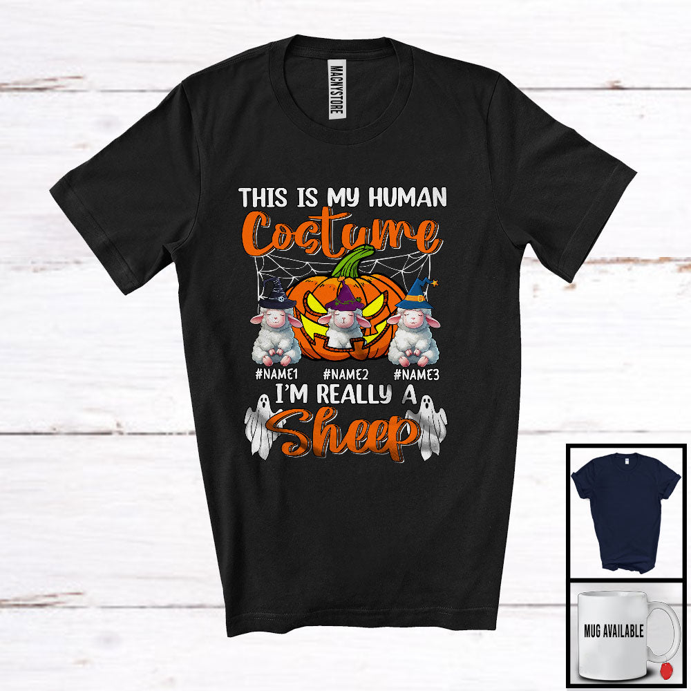 • Personalized Human Costume I'm Really A Sheep; Horror Halloween Custom Name Farmer T-Shirt. This cotton t-shirt is a durable staple product with a classic fit. One of the most popular items, it has a relaxed style made for everyday and casual wear.