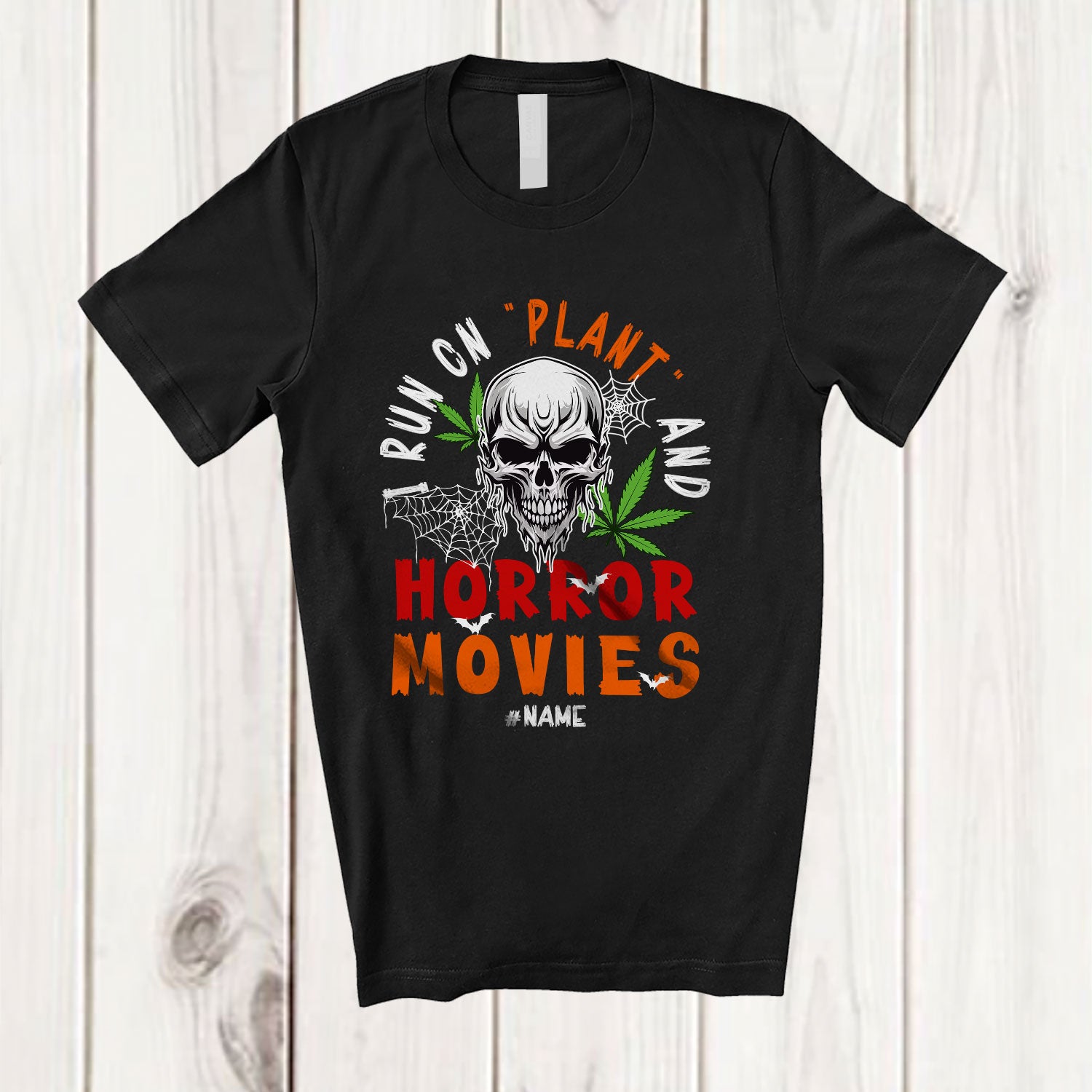 • Personalized I Run On Plant Horror Movies; Scary Halloween Custom Name Skull Stoner Family T-Shirt. This cotton t-shirt is a durable staple product with a classic fit. One of the most popular items, it has a relaxed style made for everyday and casual wear.