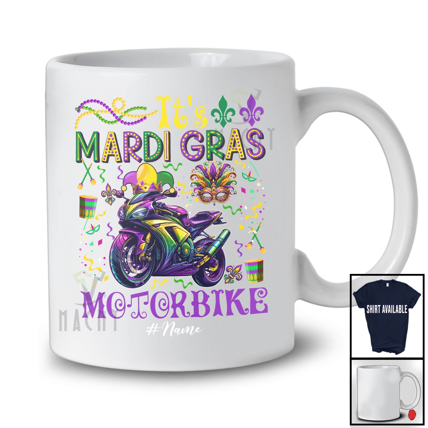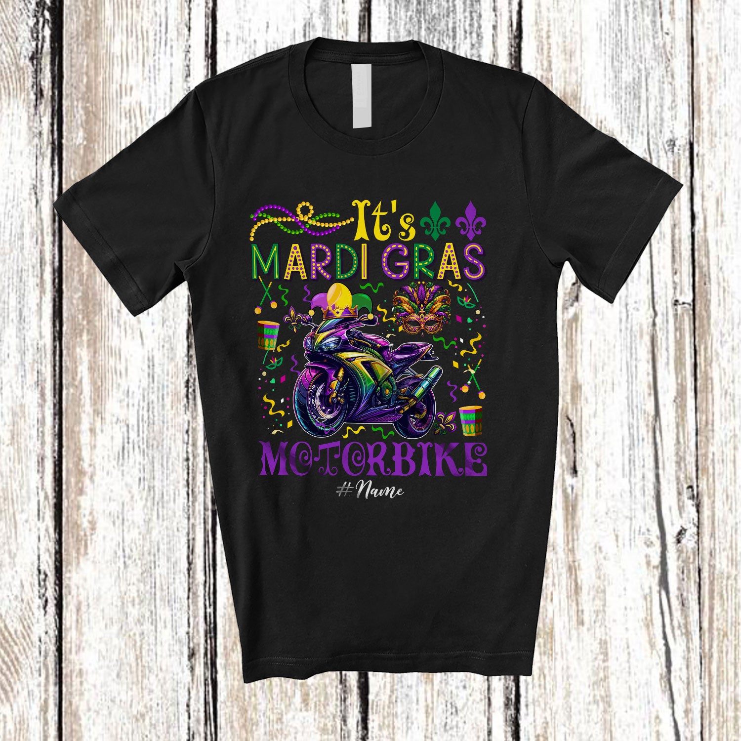 Personalized It's Mardi Gras Motorbike; Lovely Beads Custom Name Motorbike Rider; Family T-Shirt. This cotton t-shirt is a durable staple product with a classic fit. One of the most popular items, it has a relaxed style made for everyday and casual wear.