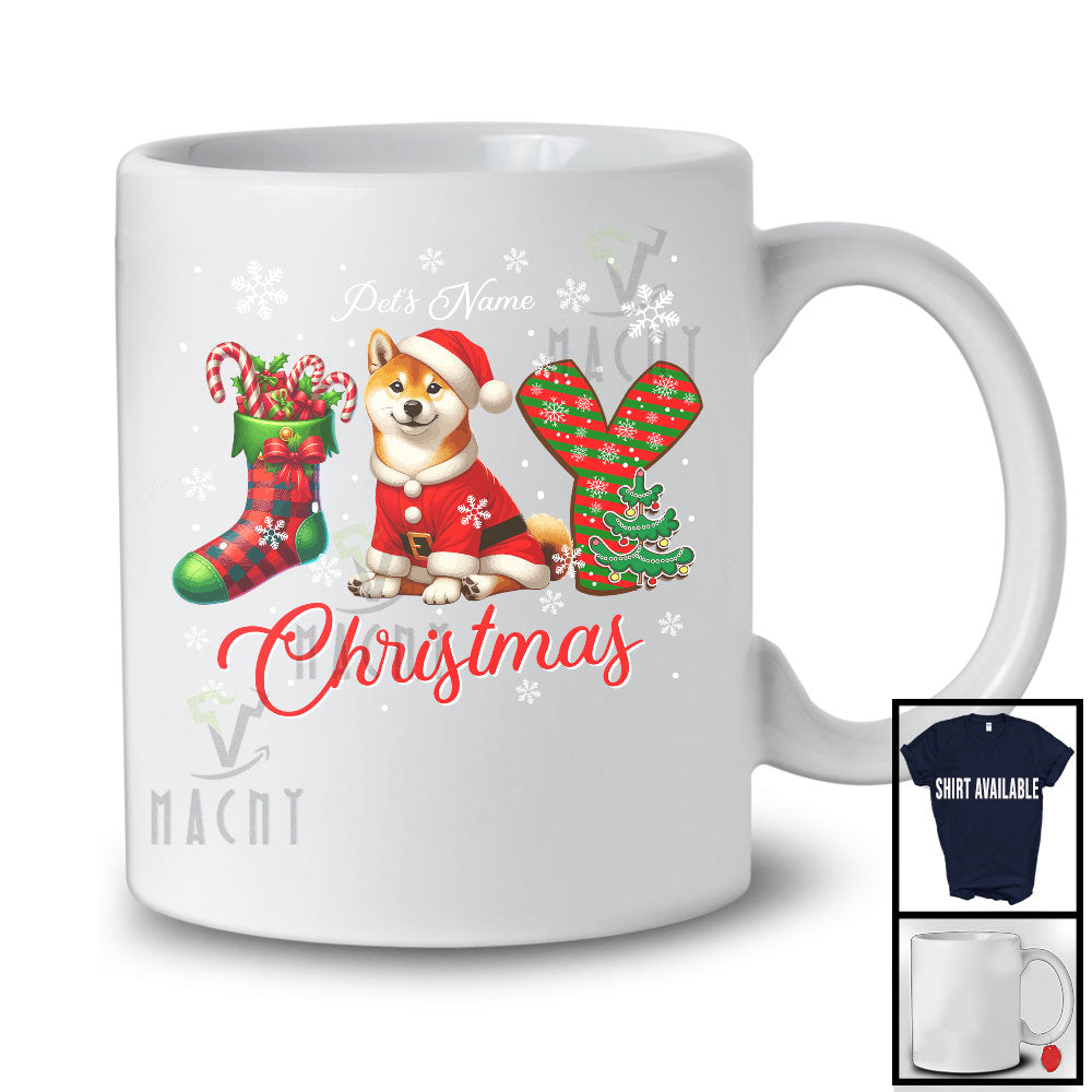 Personalized Joy Christmas, Lovely Custom Name Santa Shiba Inu, X-mas Sock Tree Snowing T-Shirt. This cotton t-shirt is a durable staple product with a classic fit. One of the most popular items, it has a relaxed style made for everyday and casual wear.