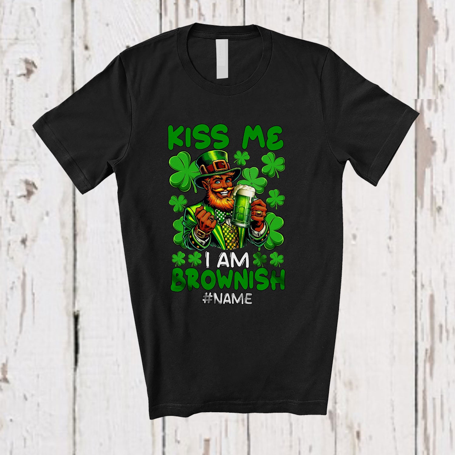 • Personalized Kiss Me I'm Brownish; Joyful St. Patrick's Day Custom Name Afro Leprechaun Beer T-Shirt. This cotton t-shirt is a durable staple product with a classic fit. One of the most popular items, it has a relaxed style made for everyday and casual wear.