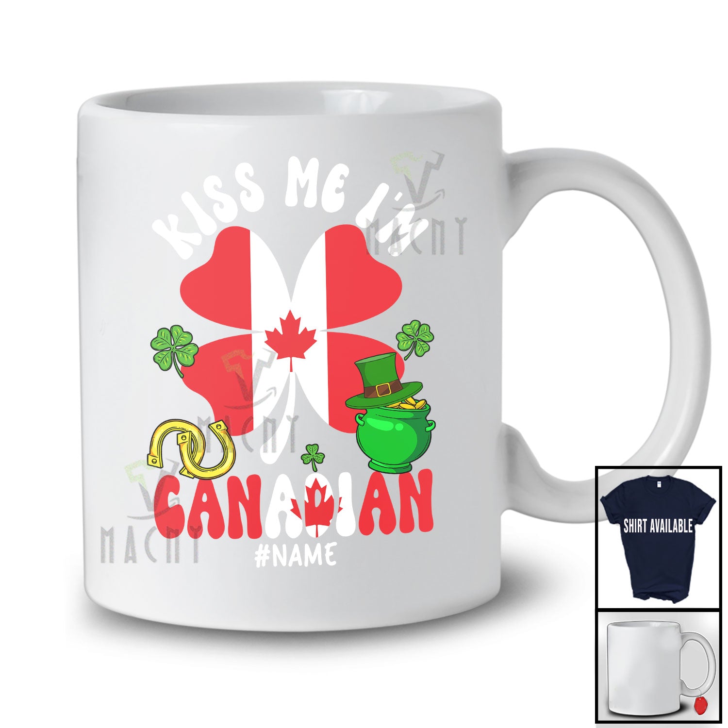 Personalized Kiss Me I'm Canadian; Fantastic St. Patrick's Day Custom Name Canadian Flag Shamrock T-Shirt. This cotton t-shirt is a durable staple product with a classic fit. One of the most popular items, it has a relaxed style made for everyday and casual wear.