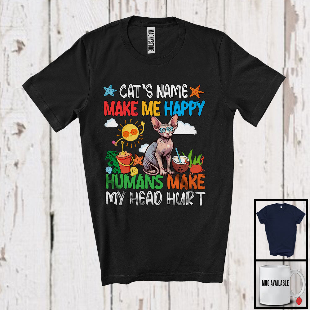 This Personalized Kitten's Custom Name Make Me Happy, Colorful Summer Vacation Sphynx Cat Owner T-Shirt is great idea gift for your family, friends in this birthday, christmas, mother's day, father's day, patrick's day or any holiday.