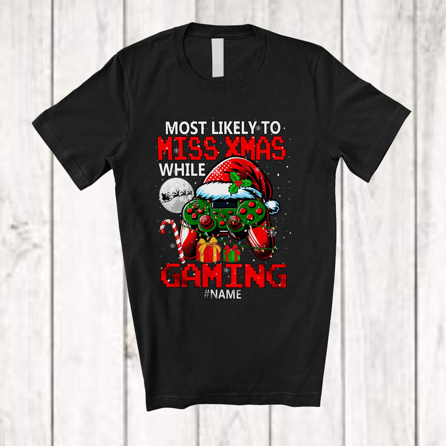 Personalized Likely To Miss X-mas While Gaming; Amusing Christmas Custom Name Santa Gamer T-Shirt. This cotton t-shirt is a durable staple product with a classic fit. One of the most popular items, it has a relaxed style made for everyday and casual wear.