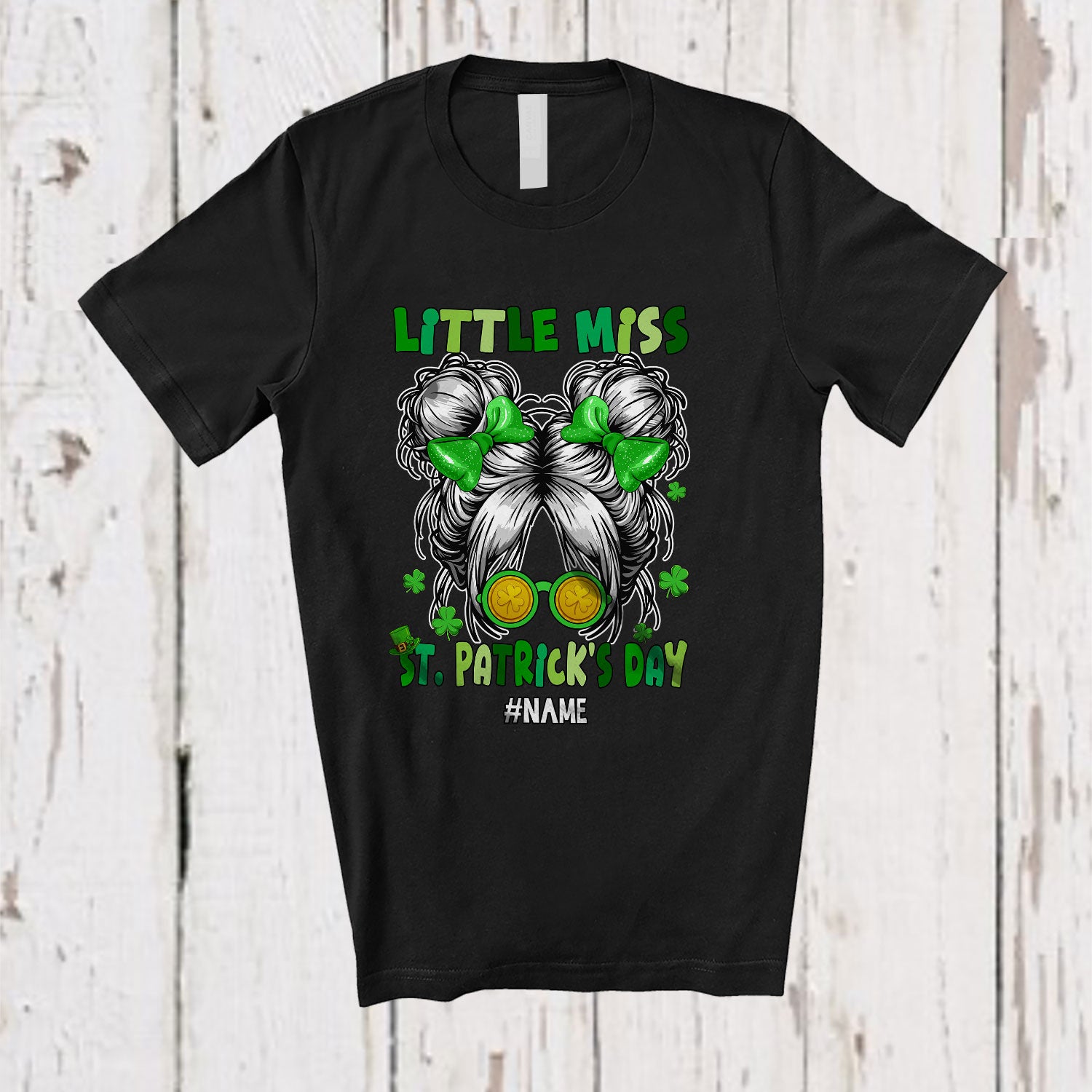 • The Personalized Little Miss St. Patrick's Day; Lovely Custom Name Messy Bun Hair Leprechaun T-Shirt is far and away, one of our most popular items. People can't seem to get enough of it.