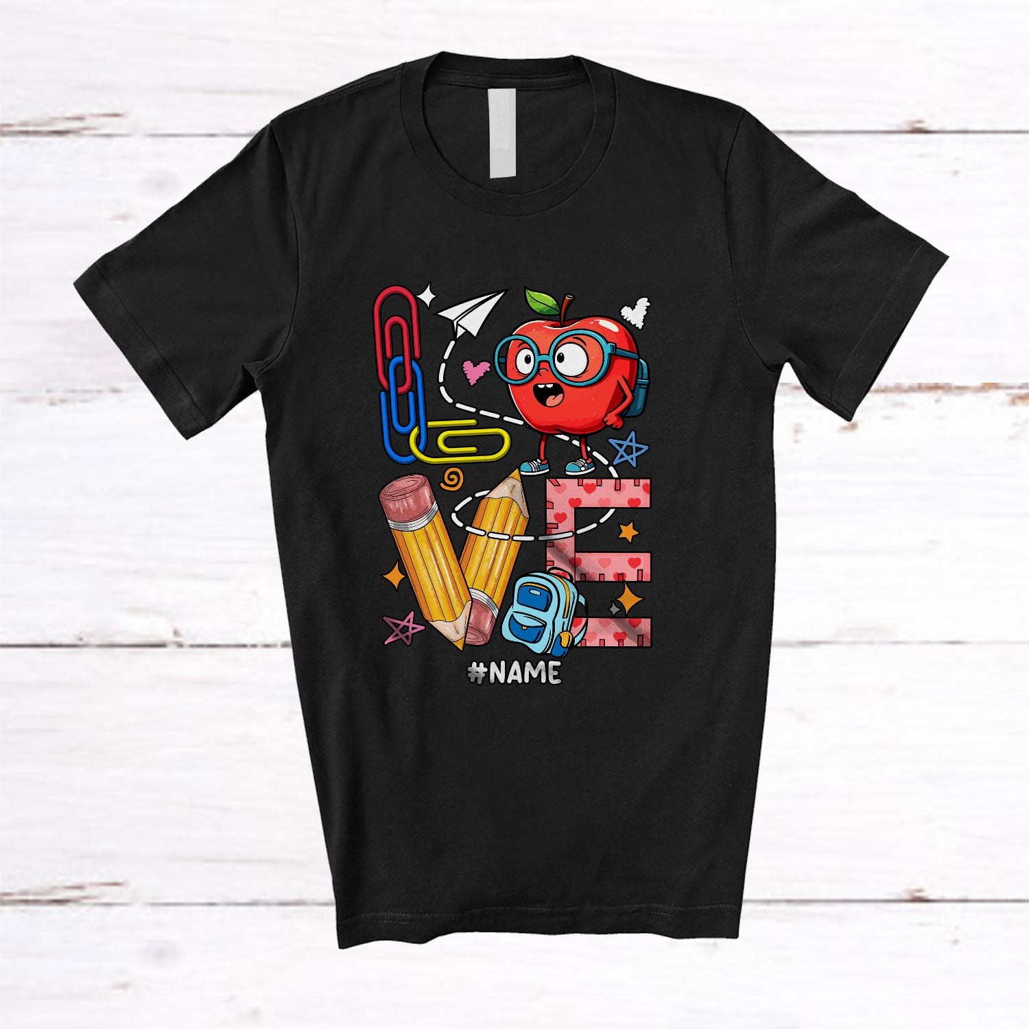 Personalized LOVE; Amazing Back To School Tools Pencil Fruits; Custom Name Students Teacher T-Shirt. This cotton t-shirt is a durable staple product with a classic fit. One of the most popular items, it has a relaxed style made for everyday and casual wear.