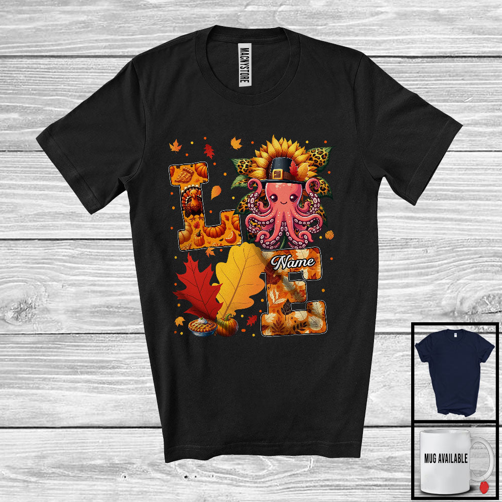 Personalized LOVE; Lovely Thanksgiving Custom Name Octopus; Leopard Sunflowers Fall Leaves T-Shirt