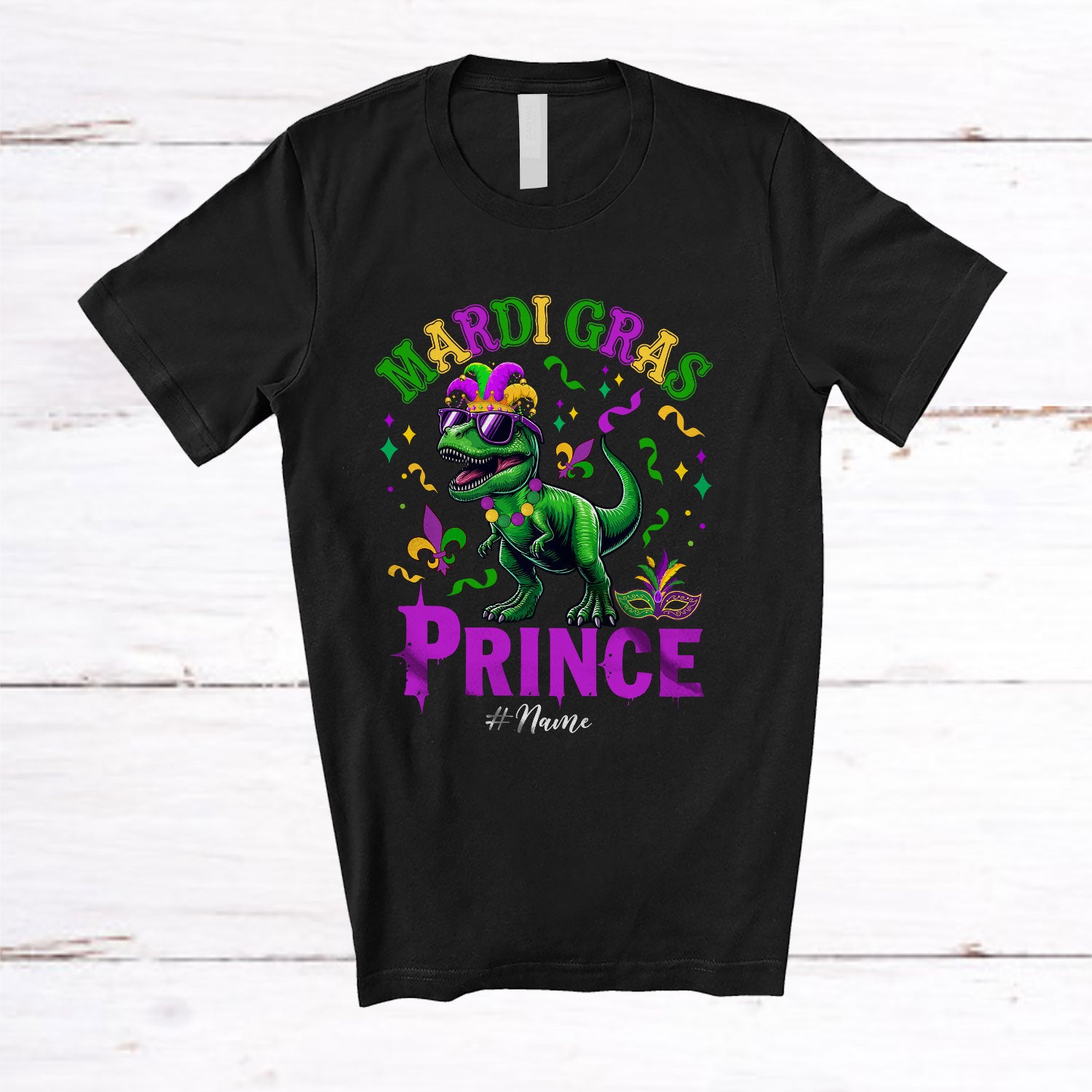 Personalized Mardi Gras Prince; Amazing Custom Name T-Rex Sunglasses Jester Hat; Boys Family T-Shirt. This cotton t-shirt is a durable staple product with a classic fit. One of the most popular items, it has a relaxed style made for everyday and casual wear.