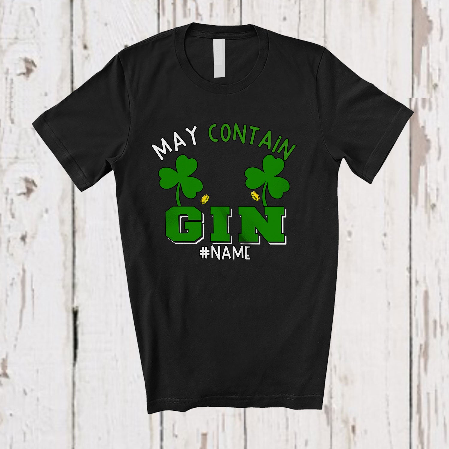Personalized May Contain Gin; Joyful St. Patrick's Day Custom Name Men; Bra Shamrock Drinking T-Shirt. This cotton t-shirt is a durable staple product with a classic fit. One of the most popular items, it has a relaxed style made for everyday and casual wear.