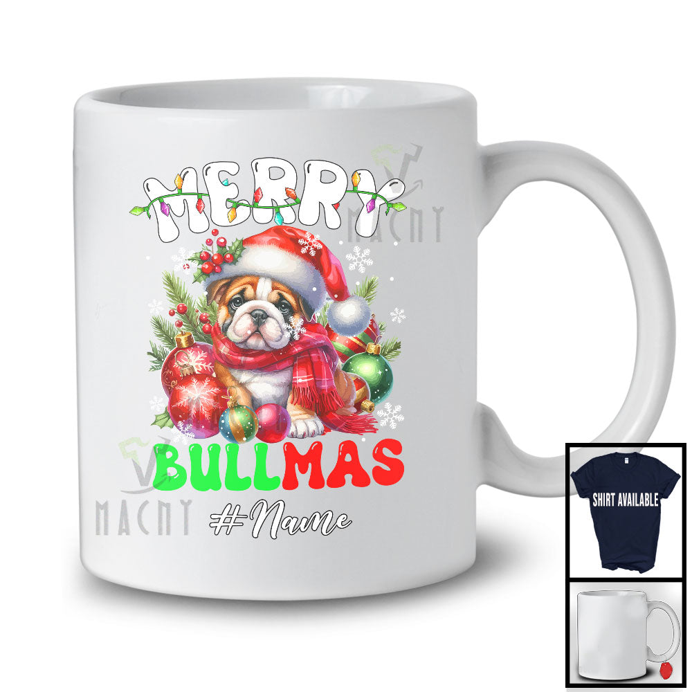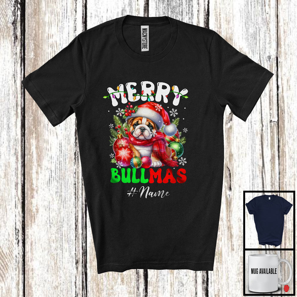 Personalized Merry Bullmas; Lovely Christmas Santa Bulldog With Ornaments; X-mas Lights T-Shirt