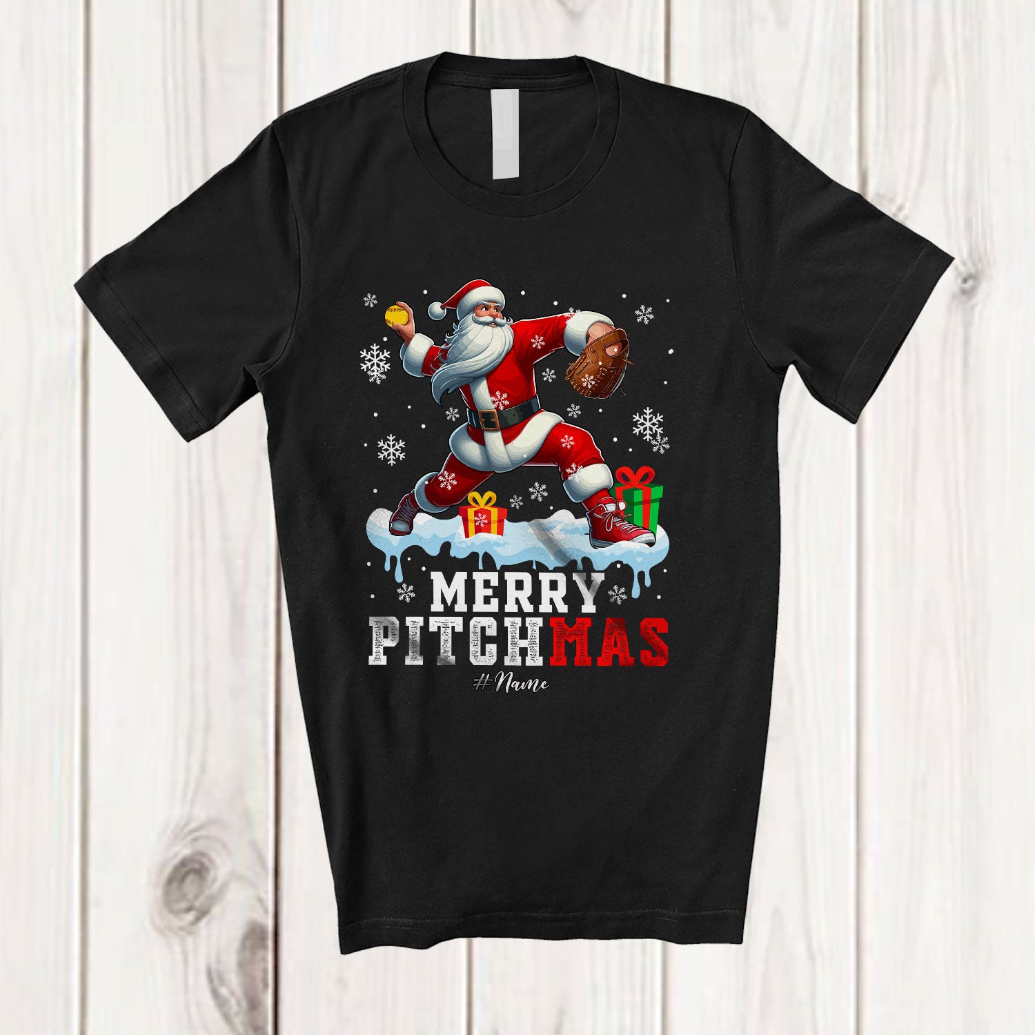 Personalized Merry Pitchmas; Fantastic Christmas Custom Name Santa Softball Pitcher Player T-Shirt