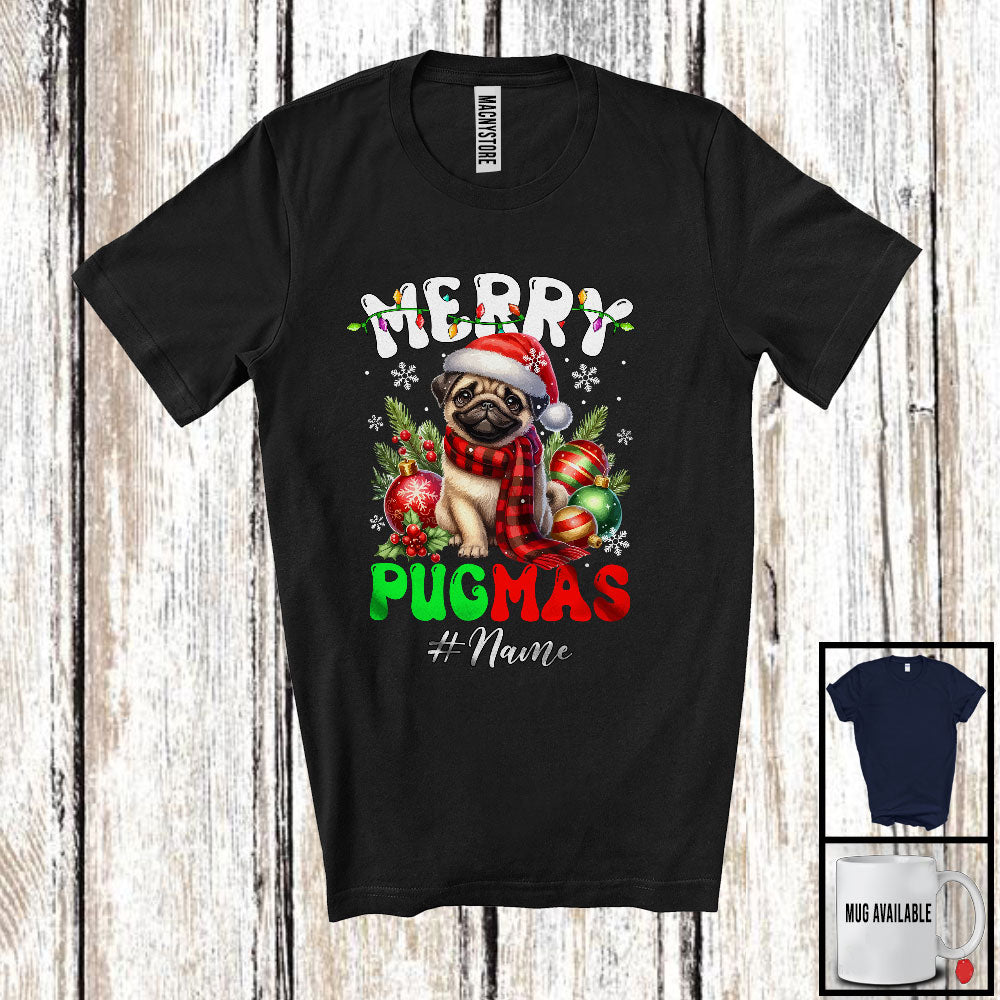 Personalized Merry Pugmas; Lovely Christmas Santa Pug With Ornaments; X-mas Lights T-Shirt