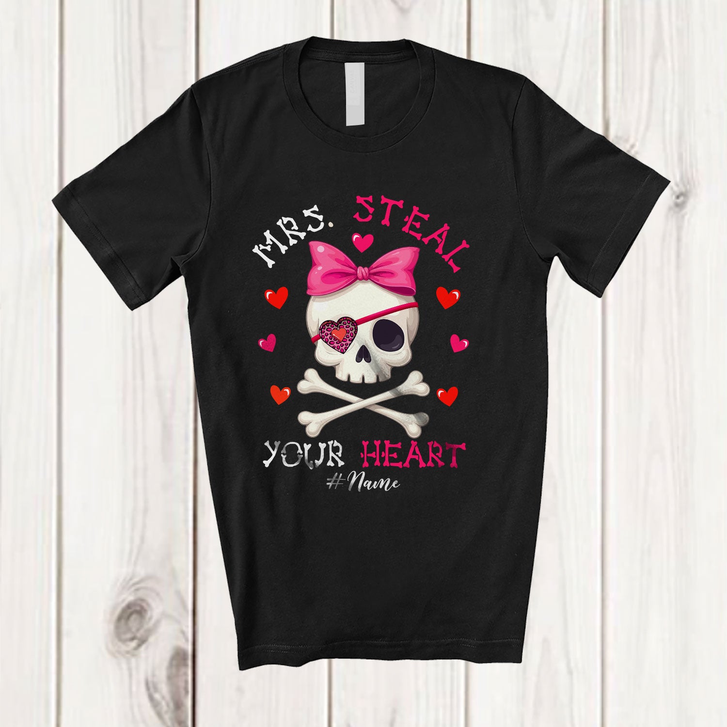 Personalized Mrs. Steal Your Heart; Lovely Valentine Pirate Skull; Custom Name Girl Couple T-Shirt. This cotton t-shirt is a durable staple product with a classic fit. One of the most popular items, it has a relaxed style made for everyday and casual wear.