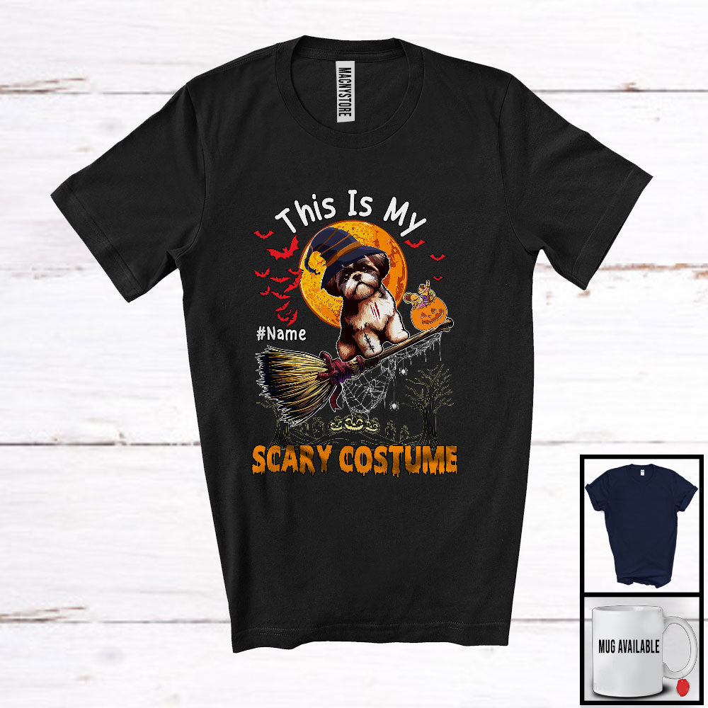 • Personalized My Scary Costume, Lovely Halloween Custom Name Shih Tzu, Witch Broom Pumpkin T-Shirt. This cotton t-shirt is a durable staple product with a classic fit. One of the most popular items, it has a relaxed style made for everyday and casual wear.