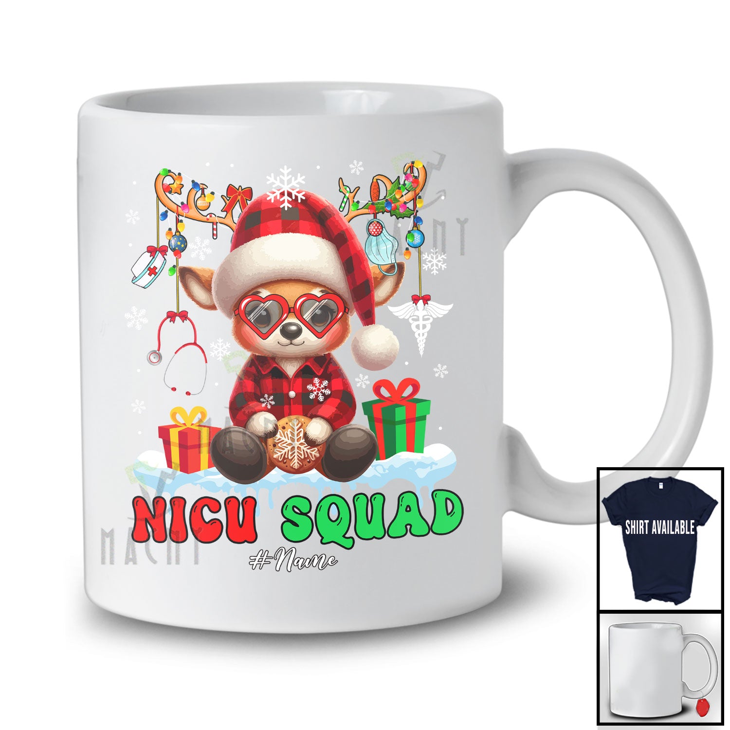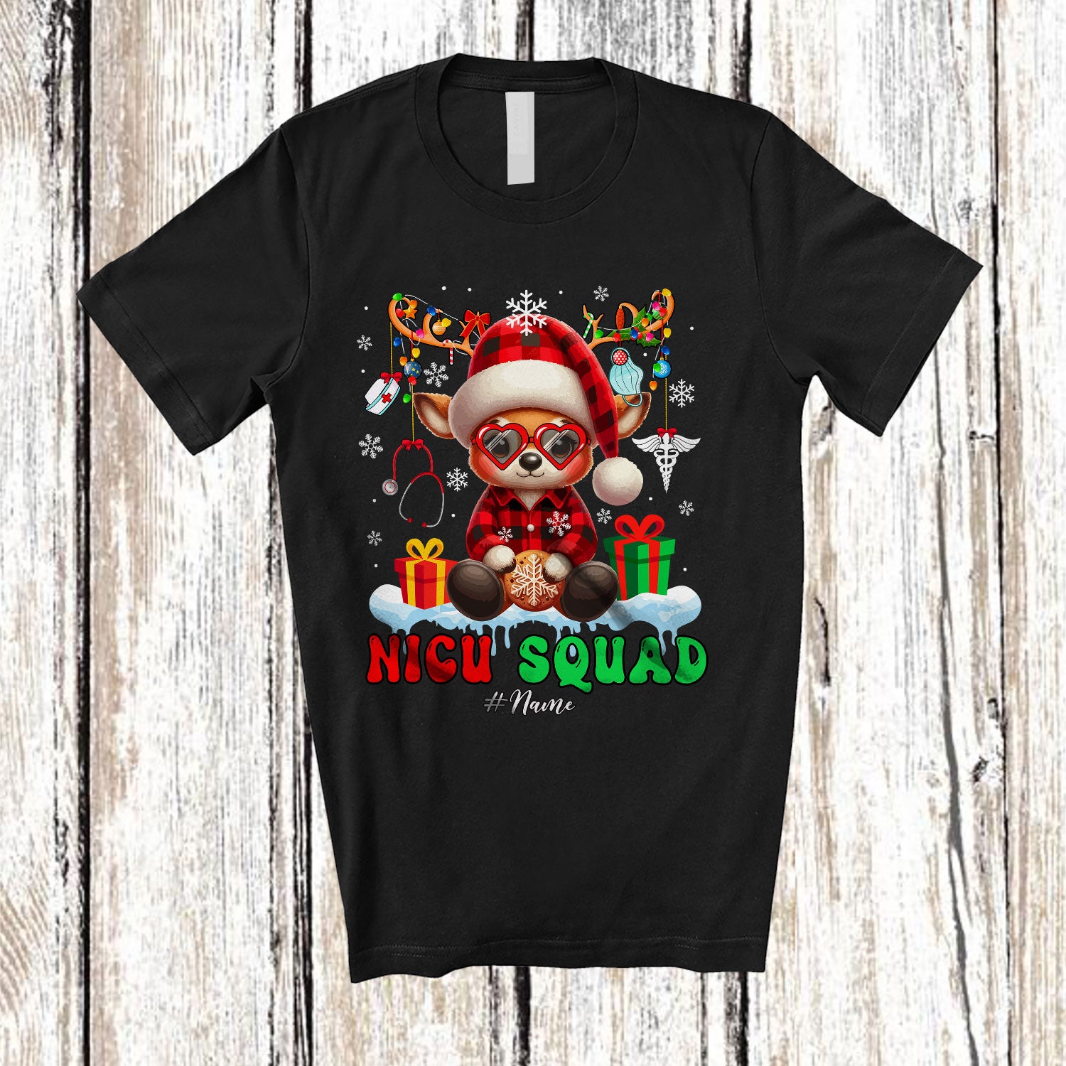Personalized NICU Squad; Fantastic Christmas Red Plaid Reindeer Snowing; Custom Name Nurse T-Shirt