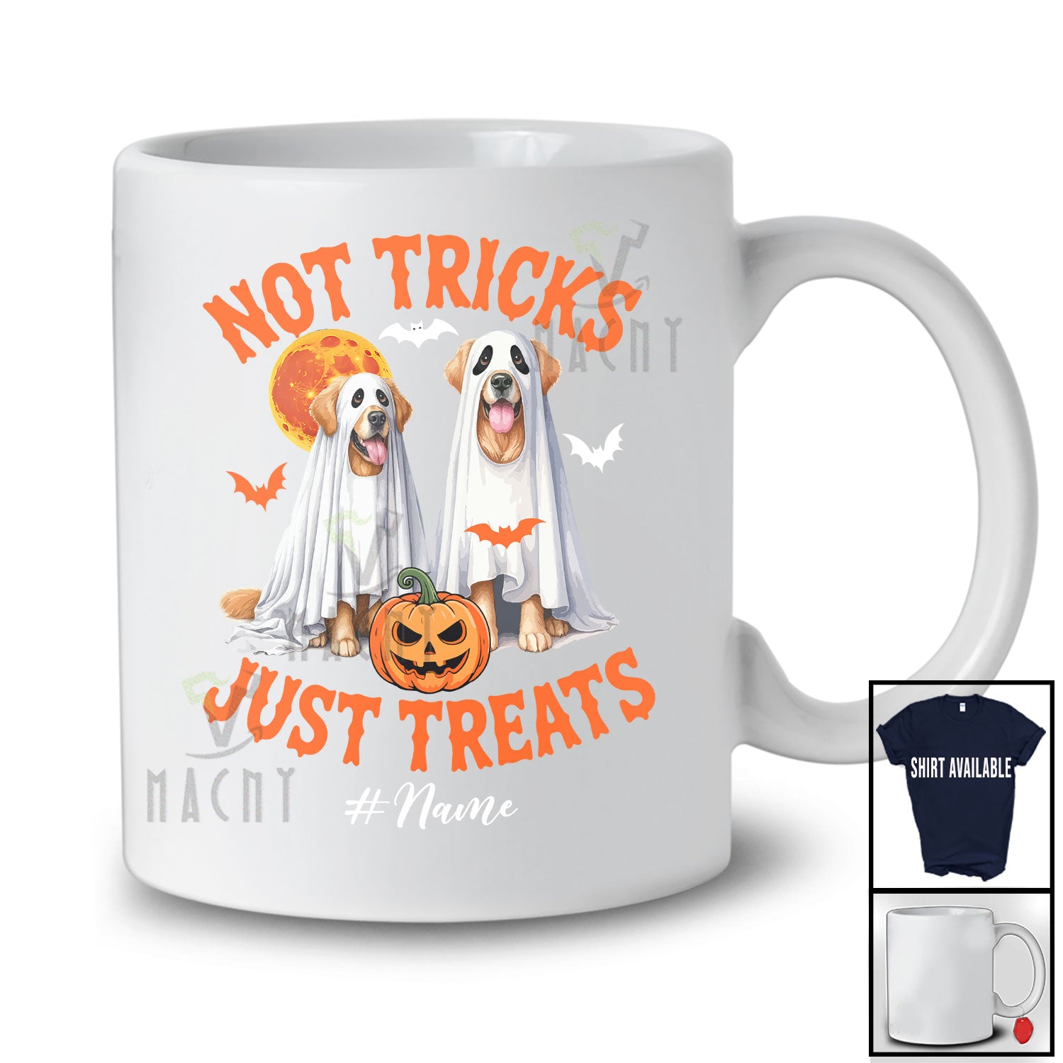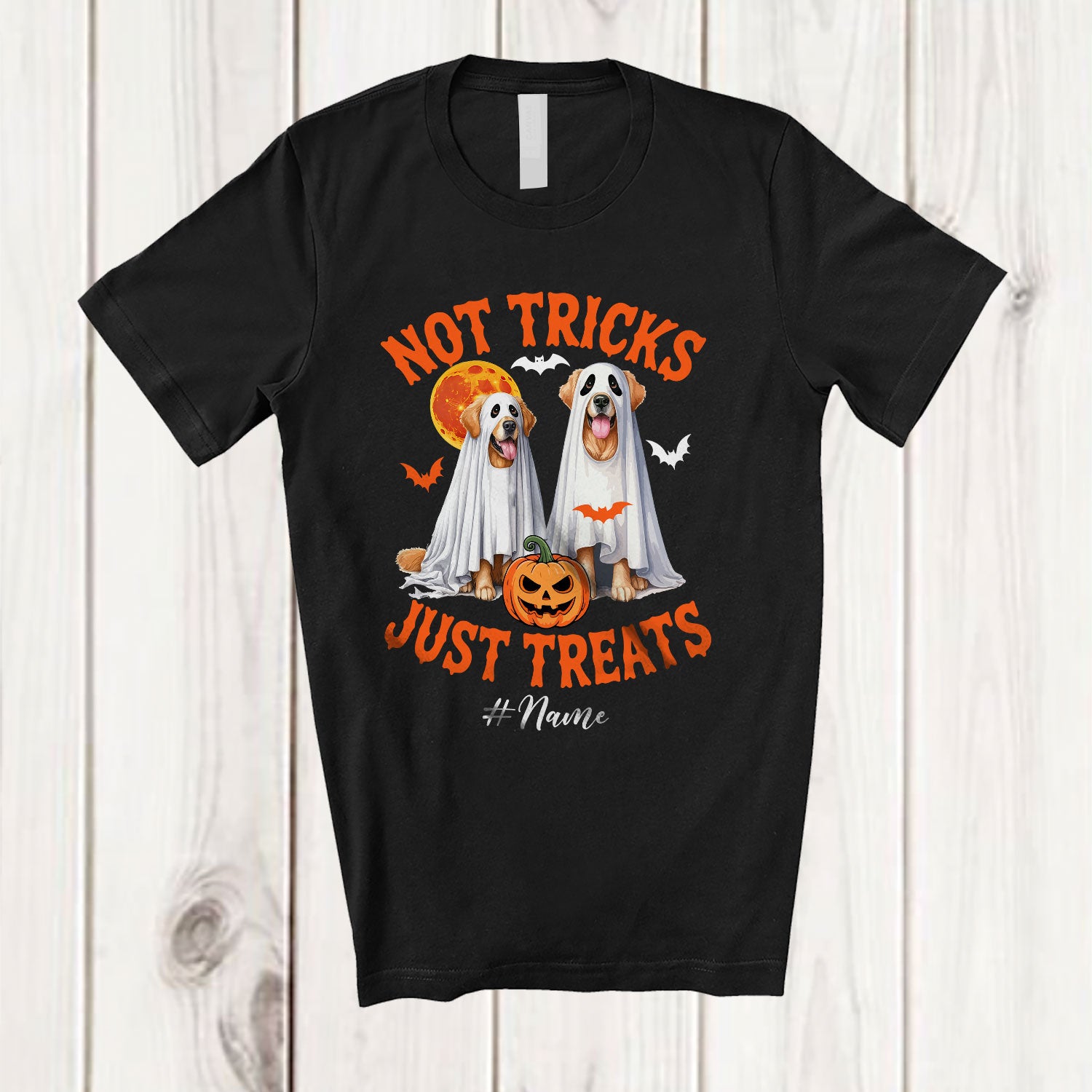 • Personalized Not Tricks Just Treats; Creepy Halloween Custom Name Two Boo Golden Retriever T-Shirt. This cotton t-shirt is a durable staple product with a classic fit. One of the most popular items, it has a relaxed style made for everyday and casual wear.