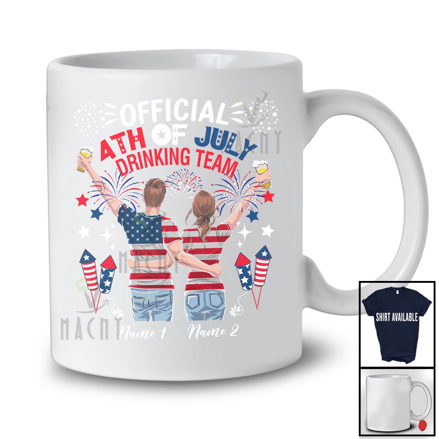 • Personalized Official 4th of July Drinking Team; Cheerful Custom Name Man Woman; Patriotic Drunker T-Shirt. This cotton t-shirt is a durable staple product with a classic fit. One of the most popular items, it has a relaxed style made for everyday and casual wear.