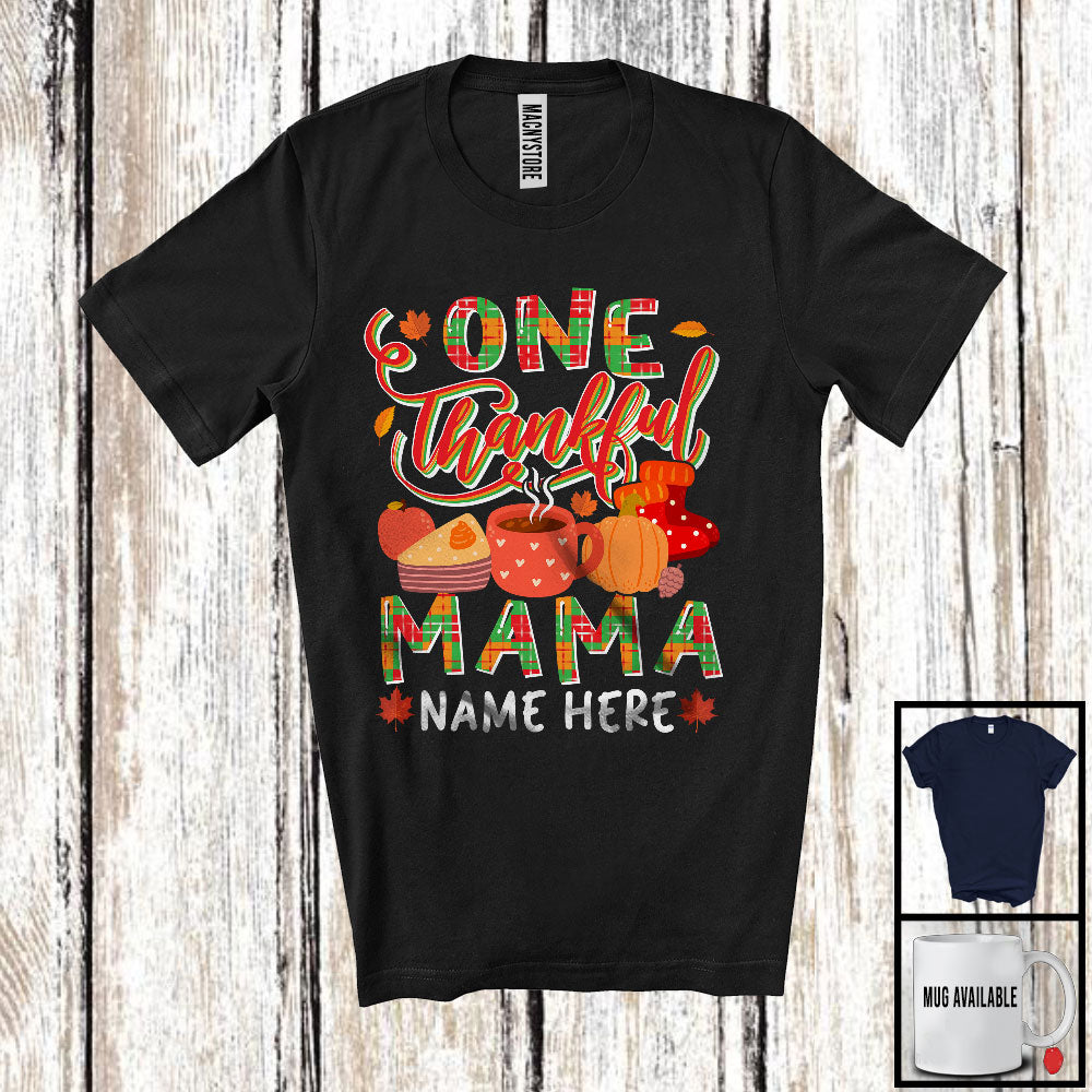 Personalized One Thankful Mama, Lovely Thanksgiving Plaid Pumpkin Coffee, Custom Name Family T-Shirt