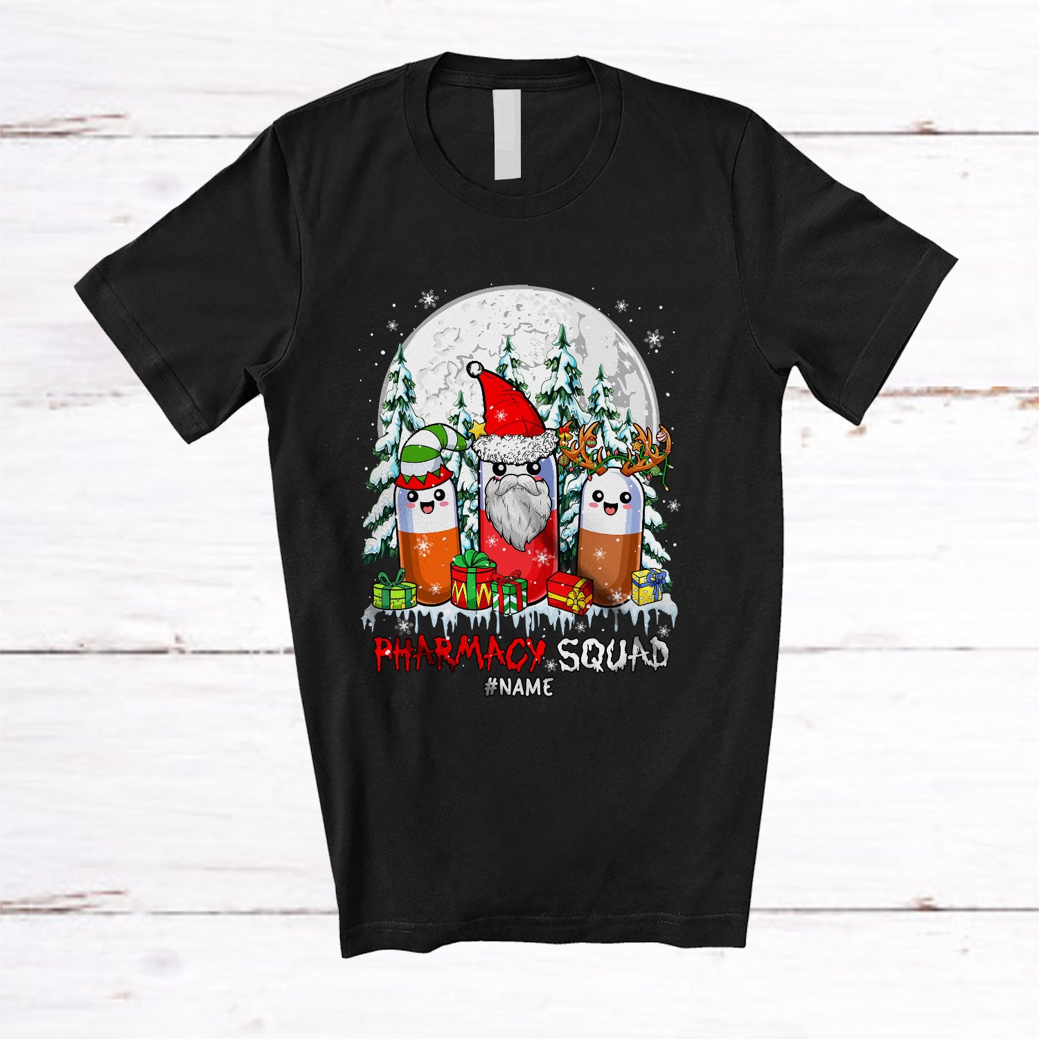Personalized Pharmacy Squad; Humorous Christmas Three Pills; Custom Name Pharmacist T-Shirt. This cotton t-shirt is a durable staple product with a classic fit. One of the most popular items, it has a relaxed style made for everyday and casual wear.