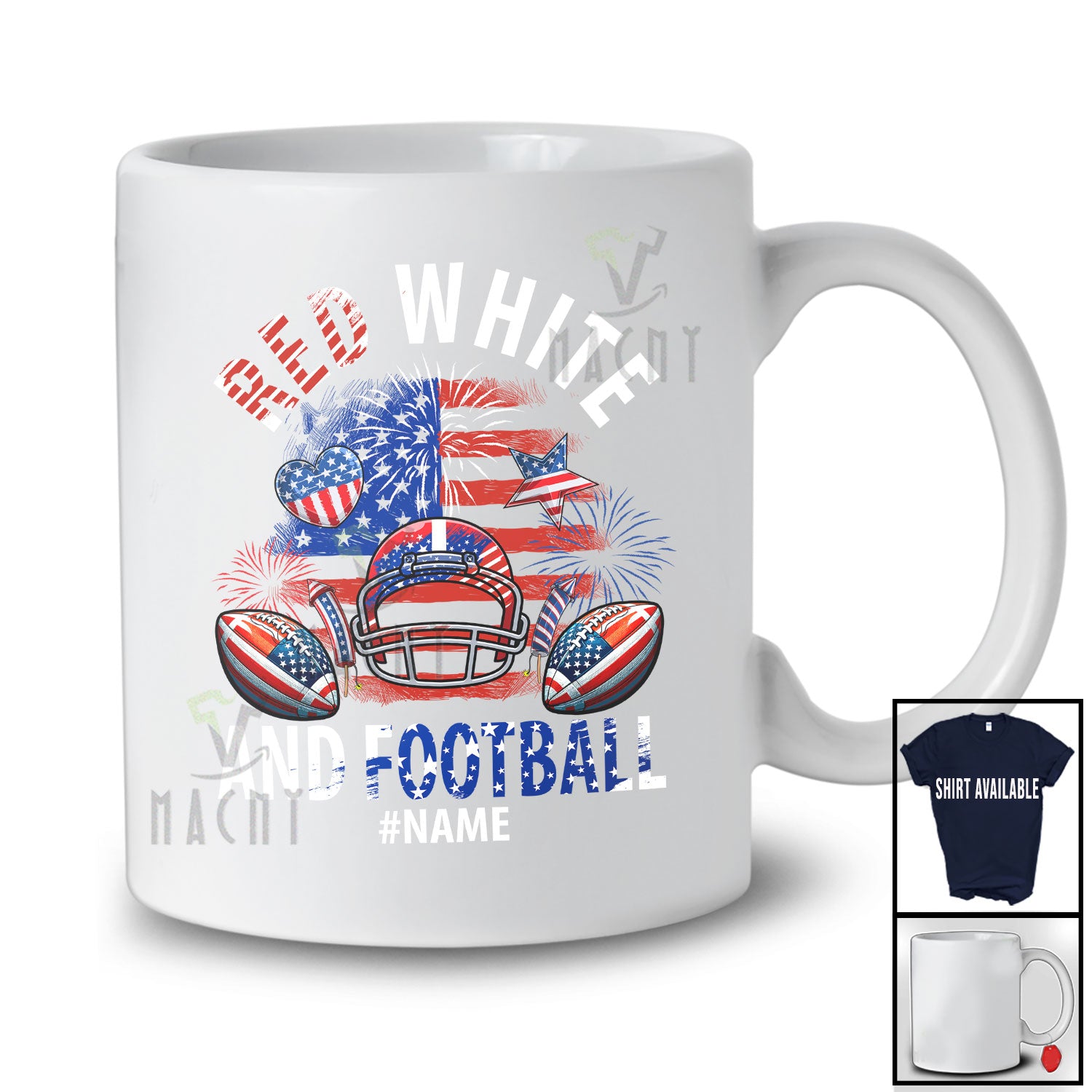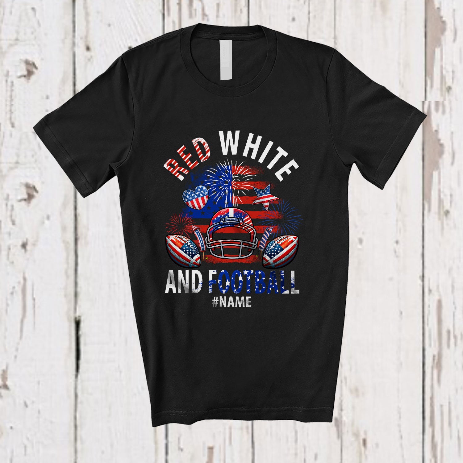 Personalized Red White And Football; Amusing 4th Of July US Flag; Custom Name Player Patriotic T-Shirt. This cotton t-shirt is a durable staple product with a classic fit. One of the most popular items, it has a relaxed style made for everyday and casual wear.