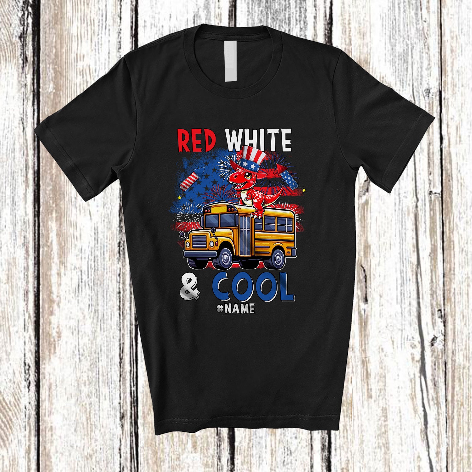 Personalized Red White & Cool; Lovely 4th Of July Custom Name T-Rex On School Bus; Patriotic T-Shirt. This cotton t-shirt is a durable staple product with a classic fit. One of the most popular items, it has a relaxed style made for everyday and casual wear.