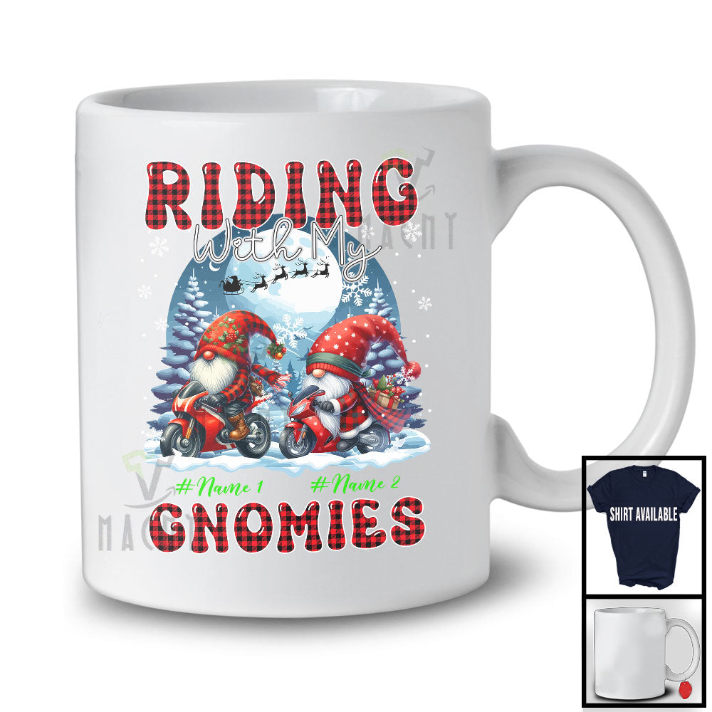 • The Personalized Riding With My Gnomies; Lovely Christmas Plaid Motorbike; Custom Name Couple Gnomes T-Shirt is evocative, to say the least, but that's why you're drawn to it in the first place.