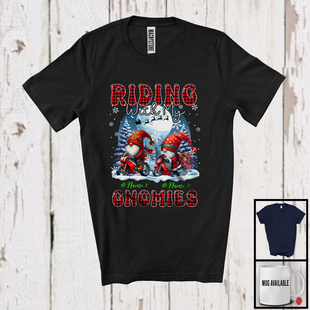 • Personalized Riding With My Gnomies; Lovely Christmas Plaid Motorbike; Custom Name Couple Gnomes T-Shirt. This cotton t-shirt is a durable staple product with a classic fit. One of the most popular items, it has a relaxed style made for everyday and casual wear.