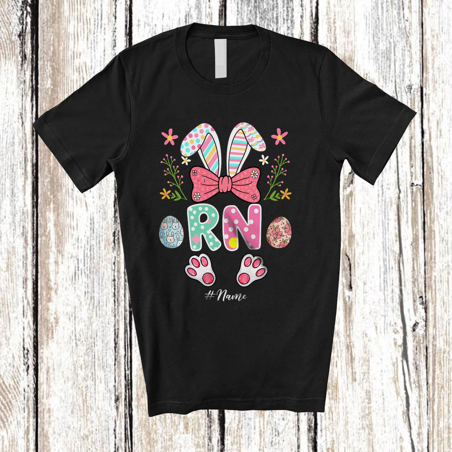 Personalized RN; Lovely Bunny Egg Hunt Flowers; Custom Name Nurse Nursing Jobs Family T-Shirt